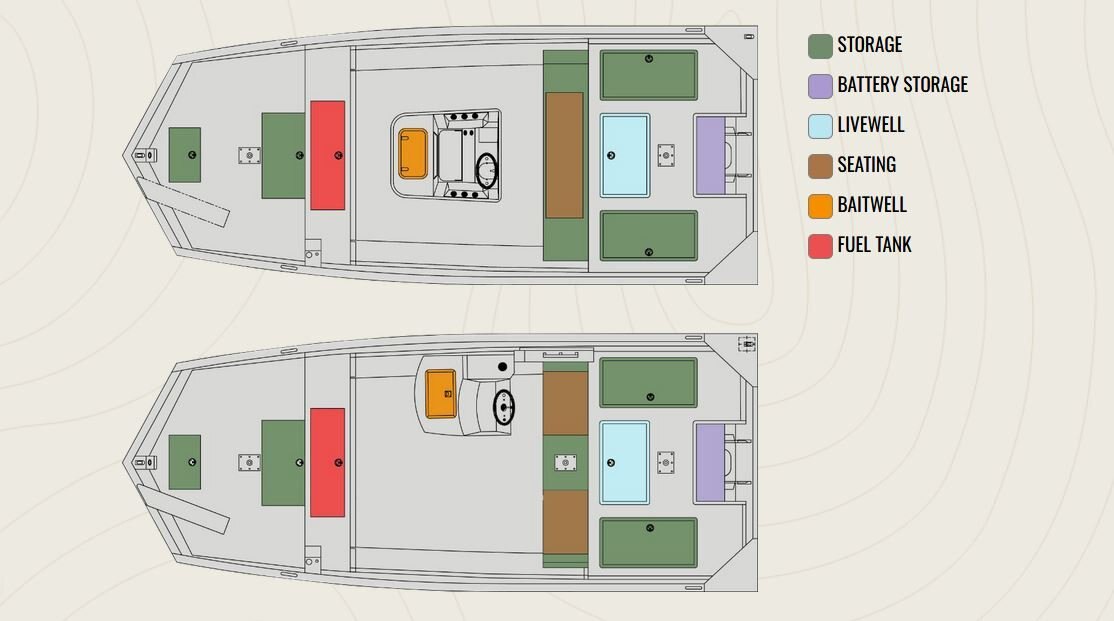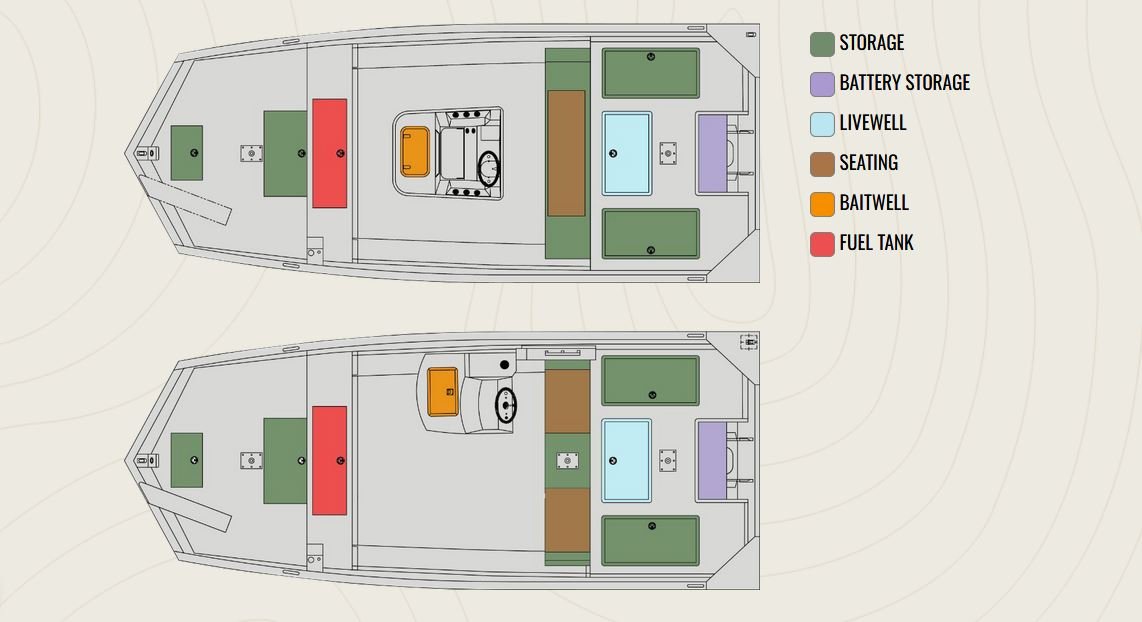 • 3° All-Welded MV Hull • Standard Paint • Anchor Locker • Oversized, Extruded Caprails w/Accessory Track and Rub Rail • Bow Storage Box • Windshield • LED Courtesy Light • Two-Fold Down Fishing Seats W/ Pedestals • Side Panels • Four Nylon Cleats • LED Navigation Lights • Auto Bilge Pump • Bow Tilt Trim Switch • 12 Volt Accessory Outlet w/ USB • Port • Covered Battery Storage Area • Battery Tray • Transducer Bracket • Two Stainless Steel Base Plates • Trolling Motor Bracket • 4 Switch Panel • FG Side Console (9.5 G Aerated Livewell) w/cushions or • FG Center Console (15 G Aerated Livewell) with cushions • NMMA Certified • 5052 Aluminum • All Aluminum Floors and Decks • Flotation Pods • Gator-Hide • Stainless Steel Bow and Stern Eyes • 36 G Bow Fuel Tank • 60 G Aerated Livewell • Trolling Motor Wiring (6 gauge) • Rear Seat Box w/Storage & Upholstered Seats • Rear Fishing Deck w/Two Storage Boxes • Side Console (9.5 Gallon Aerated livewell) w/ (2) 24” Bench Seats • Center Console (15 Gallon aerate livewell) w/ (1) 48” Bench Seat |