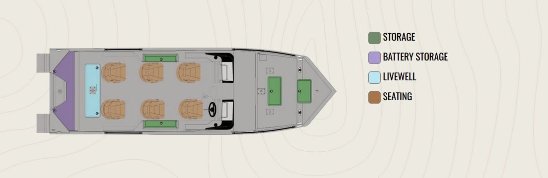 • 15° All-Welded V Hull • Standard Paint • Pods • .125 Gauge Treadplate Floor • Sea Star Hydraulic Steering • Horn • Livewell lid Insulation • Self-Draining Bow Deck w/ 25 G Livewell with Rounded Corners • Oversized, Extruded Caprail W/ Accessory Track & Rub Rail • Storage Under Console • 12 Volt Accessory Outlet with USB Port • Two Aluminum Side Console • ProCat Walk-Thru Windshield • LED Courtesy Light • Four Stainless Steel Base Plates • Four Nylon Cleats • Trolling Motor Wiring (6 gauge) • LED Navigation Lights • Speedometer • Fuel Gauge • Auto Bilge Pump • Three Battery Trays • Covered & Floored Battery Storage Area • Seat Slider (operator chair only) • Transducer Bracket • Bow Tilt-Trim Switch • Two Lockable Rod Boxes • Rear 80 G Livewell • Two Deluxe Captain’s Chairs • 67 G Belly Fuel Tank • Designated Area for Individualized Bait Tanks w/Tie-Down Eyes • 1600 GPH Fresh Water Aerator • Recirculation Pump • Wash Down Pump • NMMA Certified • 5052 Aluminum • All Aluminum Floors and Decks • Stainless Steel Bow and Stern Eyes • Tilt Helm • Flotation Pods • Gator-Hide |