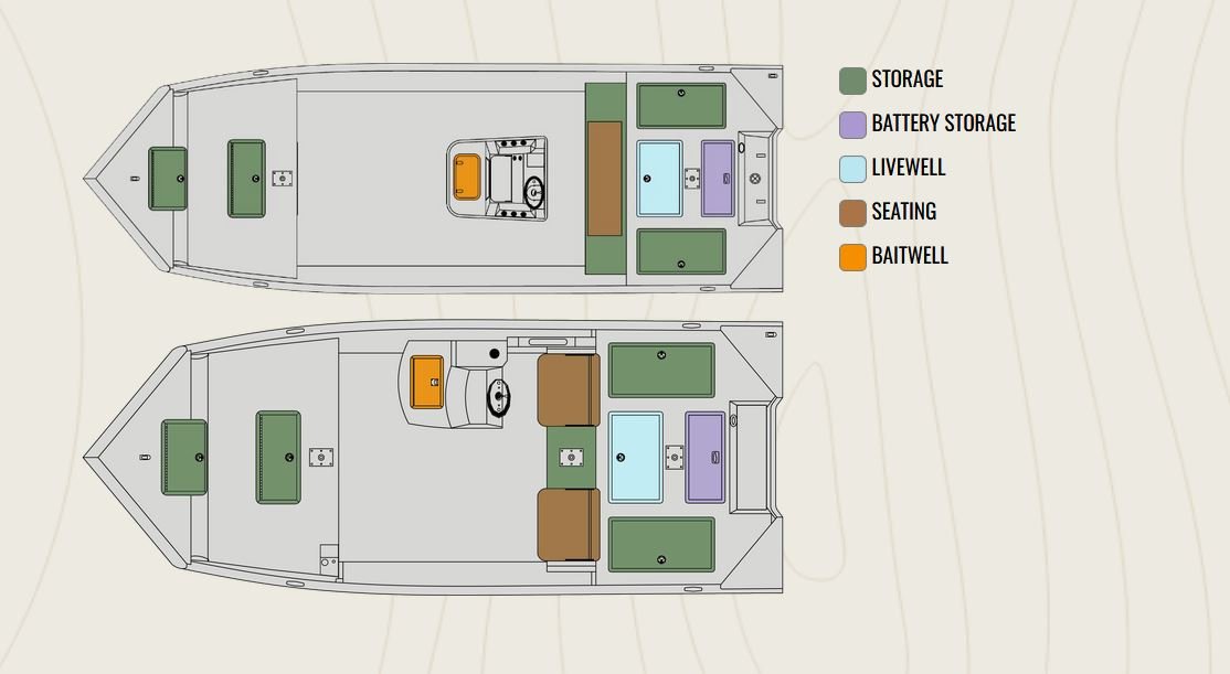 • 15° All-Welded V Hull • Standard Paint • .125 Gauge Treadplate Floor • Anchor Locker • One Lockable Bow Storage Box • Auto Bilge Pump • 12 Volt Accessory Outlet with USB Port • Four Nylon Cleats • LED Navigation Lights • Two Stainless Steel Base Plates • Bow-Tilt Trim Switch • 60 G Aerated Livewell • Rear Seat Box w/Storage and Upholstered Seats • Rear Fishing Deck w/Two Dry Storage Boxes • Trolling Motor Wiring (6 gauge) • 4 Switch Panel • Transducer Bracket • Splashwell • Two-Fold Down Fishing Seats W/ Pedastals • FG Side Console (9.5 G Aerated Baitwell) w/ (2) 24” Bench Seats and cushions or • FG Center Console (15 G Aerated Baitwell) (1) 48” Bench Seats, w/cushions • Three Battery Trays • 43 G Belly Fuel Tank • NMMA Certified • 5052 Aluminum • All Aluminum Floors and Decks • Stainless Steel Bow and Stern Eyes • Oversized extruded cap rail with accessory track & rub rail • Fuel Gauge • LED Courtesy Light • Flotation Pods • Gator-Hide • Tilt Helm • Side Panels |