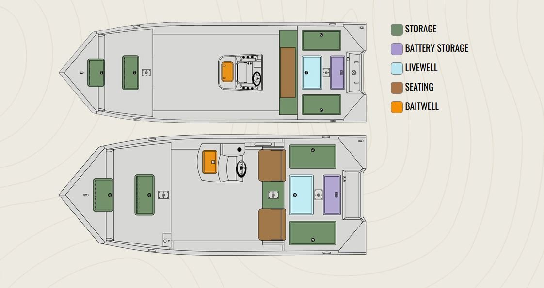 • 15° All-Welded V Hull • Standard Paint • .125 Gauge Treadplate Floor • Anchor Locker • One Lockable Bow Storage Box • Auto Bilge Pump • 12 Volt Accessory Outlet with USB Port • Four Nylon Cleats • LED Navigation Lights • Two Stainless Steel Base Plates • Bow-Tilt Trim Switch • 60 G Aerated Livewell • Rear Seat Box w/Storage and Upholstered Seats • Rear Fishing Deck w/Two Dry Storage Boxes • Trolling Motor Wiring (6 gauge) • 4 Switch Panel • Transducer Bracket • Splashwell • Two-Fold Down Fishing Seats W/ Pedastals • FG Side Console (9.5 G Aerated Baitwell) w/ (2) 24” Bench Seats and cushions or • FG Center Console (15 G Aerated Baitwell) (1) 48” Bench Seats, w/cushions • Three Battery Trays • 43 G Belly Fuel Tank • NMMA Certified • 5052 Aluminum • All Aluminum Floors and Decks • Stainless Steel Bow and Stern Eyes • Oversized extruded cap rail with accessory track & rub rail • Fuel Gauge • LED Courtesy Light • Flotation Pods • Gator-Hide • Tilt Helm • Side Panels |