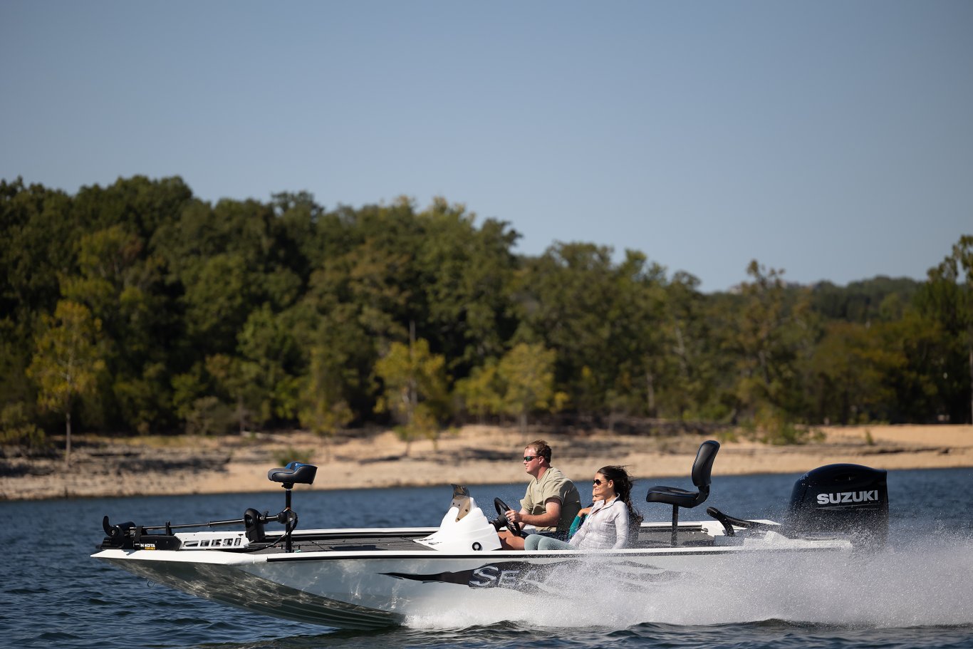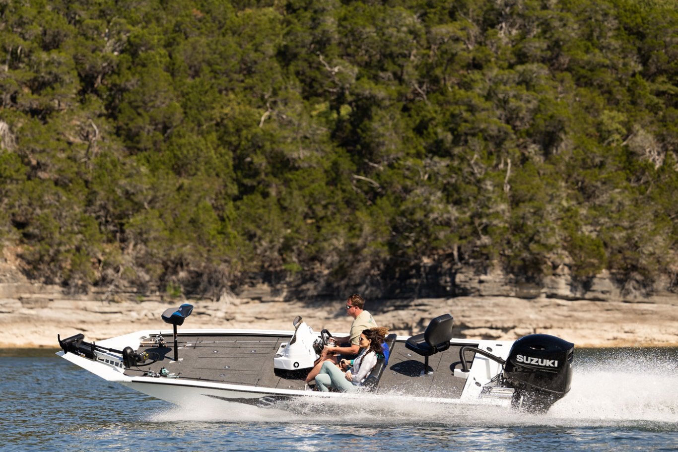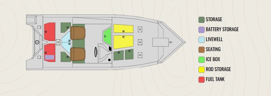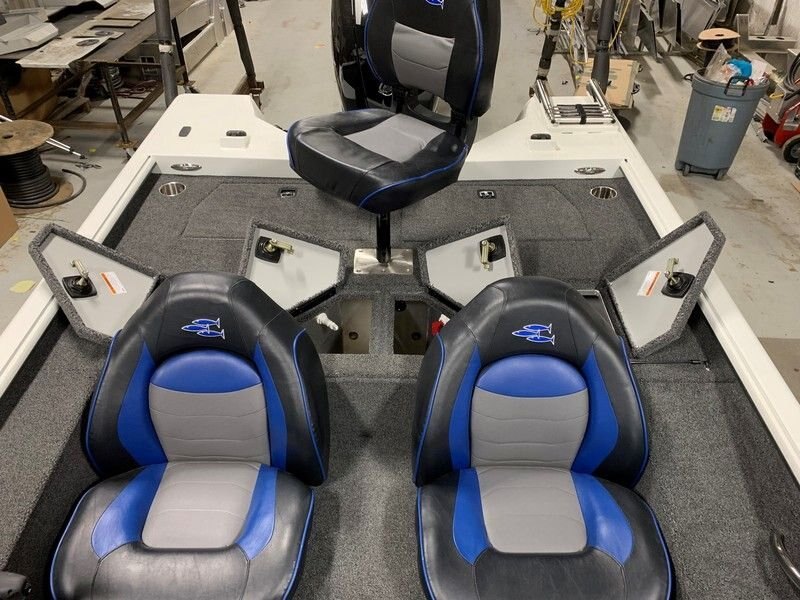 • 10° All-Welded Hull • Urethane Paint • .100 Gauge Aluminum Hull • All-Aluminum Floors and Decks • 4927 Square Inches of Front Deck Space • 3302 Square Inches of Rear Deck Space • Lockable Lighted 7’ Center Rod Box • Lockable Lighted 7’ Port Rod Box • Stainless-Steel Pop-Up Cleats • Removable Windshield • Passenger Assist Handles • 7 Stainless Steel Cup Holders • Automatic Bilge Pump • Deluxe Bucket Seats with Storage • Fold Down Fishing Seat with Pedestal • Pro Casting Seat with Pedestal • 16 oz. Marine Grade Carpet • Built in 39 Bow Step Cooler • Splashwell • 35 G Livewell with Double Lids & Lights • Livewell Recirculation & Pump-out System • Two 13 G Fuel Tanks • Recessed Area for Foot Control Trolling Motor • Two Rod Straps on Deck • Four Stainless Steel Base Plates • Two Lockable Lighted Storage Boxes • Two Lockable Rear Storage Boxes • Fish Ruler • Four Battery Trays • LED Courtesy Light on Console • Volt Meter • Trolling Motor Wiring • Bow Tilt-Trim Switch • LED Removable Navigation Lights • 12 Volt Accessory Outlet with USB Port • NMMA Certified • 5052 Aluminum • All Aluminum Floors and Decks • Stainless Steel Bow and Stern Eyes • Tilt Helm |