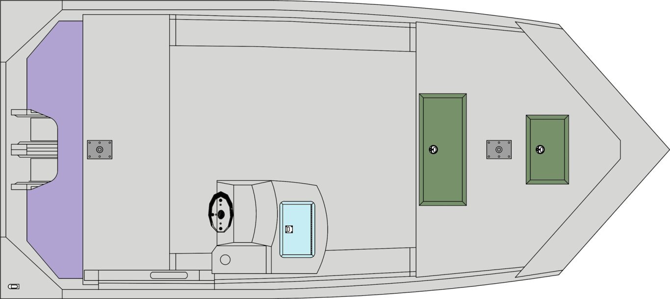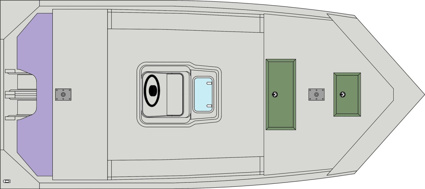 • 3° All-Welded MV Hull • Standard Paint • .125 Gauge Treadplate Floor • High Bow Deck • FG Side Console (9.5 G Aerated Livewell) w/cushion or • FG Center Console (12 G Aerated Livewell) w/cushion • Windshield • Tilt-Trim Switch • LED Courtesy Light • Extra Wide Rear Bench Seat • Four Nylon Cleats • Two-Fold Down Fishing Seats w/Pedestals • Trolling Motor Bracket • Two Stainless Steel Base Plates • Trolling Motor Wiring (8 Gauge) • LED Navigation Lights • Manual Bilge Pump • 12 Volt Accessory Outlet with USB Port • Two Battery Trays • Side Panels • Rear Hinged Battery/Fuel Tank Lid • Transducer Bracket • Oversized extruded cap rail with accessory track & rub rail • NMMA Certified • 5052 Aluminum • All Aluminum Floors and Decks • Stainless Steel Bow and Stern Eyes • Gator-Hide |
