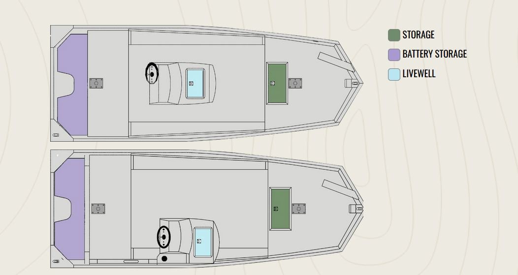 • 3° All-Welded MV Hull • Standard Paint • .125 Gauge Treadplate Floor • High Bow Deck • FG Side Console (9.5 G Aerated Livewell) w/cushion or • FG Center Console (12 G Aerated Livewell) w/cushion • Windshield • Tilt-Trim Switch • LED Courtesy Light • Extra Wide Rear Bench Seat • Four Nylon Cleats • Two-Fold Down Fishing Seats w/Pedestals • Trolling Motor Bracket • Two Stainless Steel Base Plates • Trolling Motor Wiring (8 Gauge) • LED Navigation Lights • Manual Bilge Pump • 12 Volt Accessory Outlet with USB Port • Two Battery Trays • Side Panels • Rear Hinged Battery/Fuel Tank Lid • Transducer Bracket • Oversized extruded cap rail with accessory track & rub rail • NMMA Certified • 5052 Aluminum • All Aluminum Floors and Decks • Stainless Steel Bow and Stern Eyes • Gator-Hide |