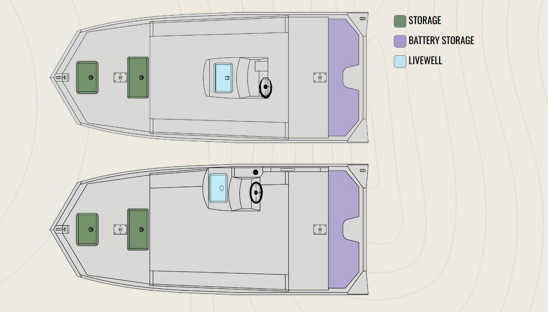 • 3° All-Welded MV Hull • Standard Paint • .125 Gauge Treadplate Floor • High Bow Deck • FG Side Console (9.5 G Aerated Livewell) w/cushion or • FG Center Console (12 G Aerated Livewell) w/cushion • Windshield • Tilt-Trim Switch • LED Courtesy Light • Extra Wide Rear Bench Seat • Four Nylon Cleats • Two-Fold Down Fishing Seats w/Pedestals • Trolling Motor Bracket • Two Stainless Steel Base Plates • Trolling Motor Wiring (8 Gauge) • LED Navigation Lights • Manual Bilge Pump • 12 Volt Accessory Outlet with USB Port • Two Battery Trays • Side Panels • Rear Hinged Battery/Fuel Tank Lid • Transducer Bracket • Oversized extruded cap rail with accessory track & rub rail • NMMA Certified • 5052 Aluminum • All Aluminum Floors and Decks • Stainless Steel Bow and Stern Eyes • Gator-Hide |