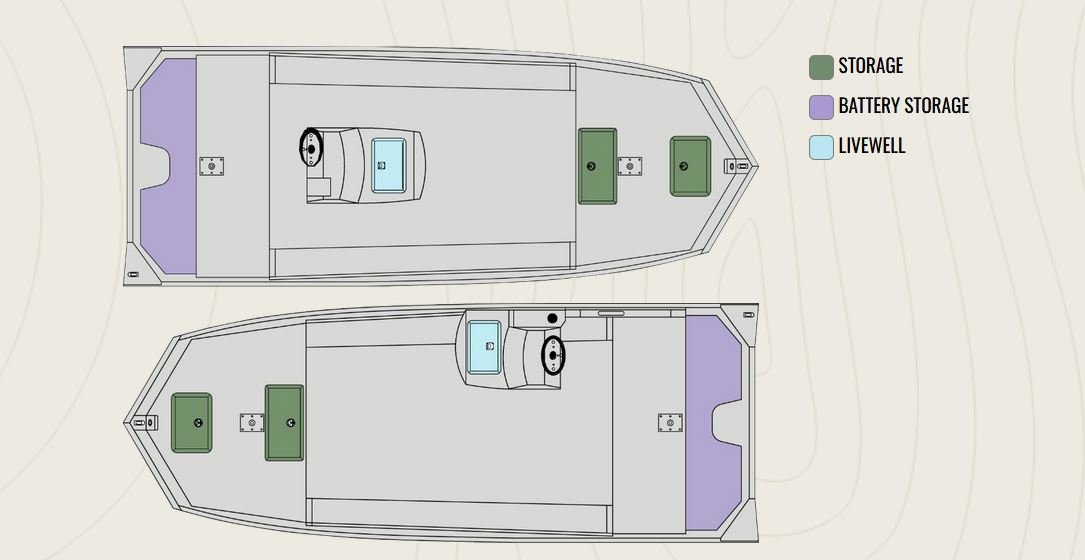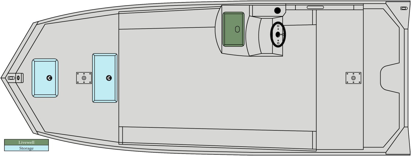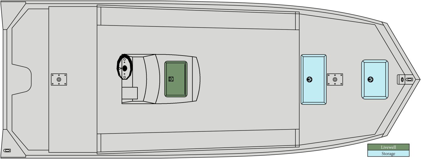 • 3° All-Welded MV Hull • Standard Paint • .125 Gauge Treadplate Floor • High Bow Deck • FG Side Console (9.5 G Aerated Livewell) w/cushion or • FG Center Console (12 G Aerated Livewell) w/cushion • Windshield • Tilt-Trim Switch • LED Courtesy Light • Extra Wide Rear Bench Seat • Four Nylon Cleats • Two-Fold Down Fishing Seats w/Pedestals • Trolling Motor Bracket • Two Stainless Steel Base Plates • Trolling Motor Wiring (8 Gauge) • LED Navigation Lights • Manual Bilge Pump • 12 Volt Accessory Outlet with USB Port • Two Battery Trays • Side Panels • Rear Hinged Battery/Fuel Tank Lid • Transducer Bracket • Oversized extruded cap rail with accessory track & rub rail • NMMA Certified • 5052 Aluminum • All Aluminum Floors and Decks • Stainless Steel Bow and Stern Eyes • Gator-Hide |
