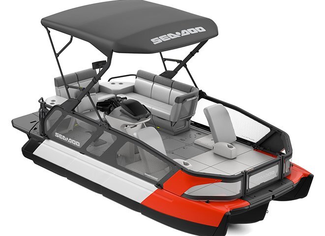 Switch bimini top Clear-view side panels Stern lounge Sun pads & Sport lounge Sun pad backrest 2x corner table Driver seat with bolster Rearview mirror Garmin 7'' touchscreen GPS BRP Audio System Glove box with dual USB port 12V outlet Full Swim platform Retractable boarding ladder Quick-attach inflatable holder Ski tow eye LinQ™ attachment points Under-deck storage compartment Console storage net Integrated anchor storage LED Navigation lights LED Courtesy light Integrated cleats (4) 650W Battery Generator