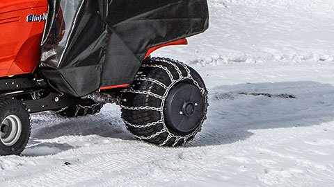 Tire chains and weights (33- or 50-lbs each) enhance traction on your mower with front tractor attachments or on slippery ground.