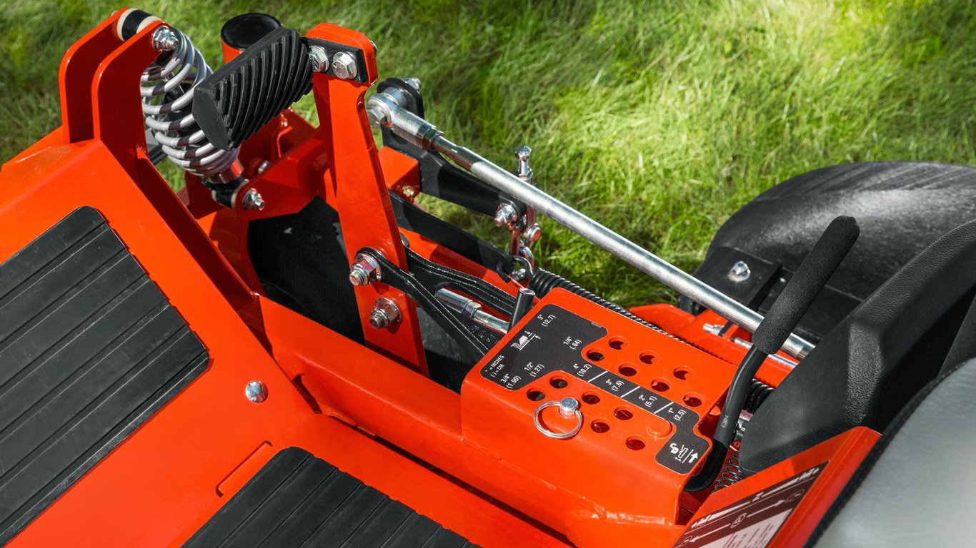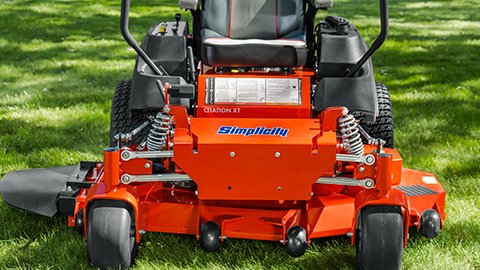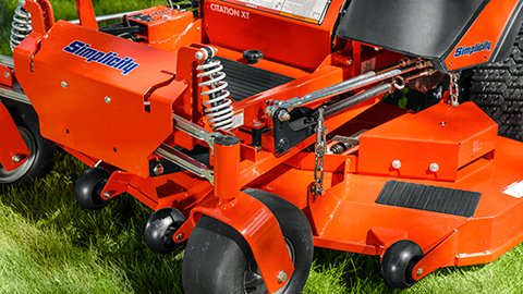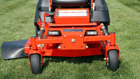 Simplicity offers comfortable commercial-style mowing with a front- and rear-wheel suspension system for increased mowing productivity. It also features a comfortable high back seat, adjustable steering levers, convenient controls and padded footrests.