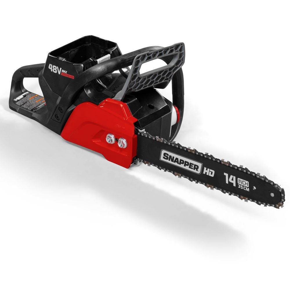 The Snapper HD cordless chainsaw powered by a Briggs & Stratton® 48V Max** 2.0 Lithium-Ion Battery makes trimming trees or logs easier than ever. It provides up to 90 cuts and a run time of 21 minutes* on a fully charged battery (additional runtime available with separate 5.0 battery). With Brushless Motor Technology, this chainsaw will provide the power and reliability you need for years to come.