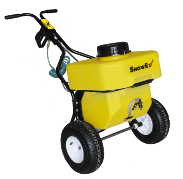 The SL-80SS push sprayer is ideal for spraying brine on sidewalks and in other small areas. Unlike many other products on the market, the SnowEx SL-80SS is completely electric powered pump, using a rechargeable battery. It can spray up to 48 inches wide through the front-mounted nozzle. Or it can spray brine through the professional duty spray wand. The SL-80SS comes with a stainless steel frame and rechargeable battery.