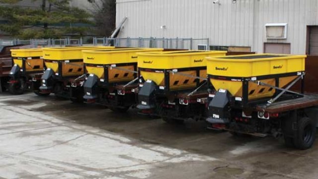 Get the big jobs done with the high performance SP-9300 and SP-9500 SnowEx® spreaders. With large capacities of 3.2 and 4.2 cubic yards to spread any combination of bulk salt and sand, these spreaders are perfect for large trucks and contractors who want to cut down on extra trips to the yard for reloading.