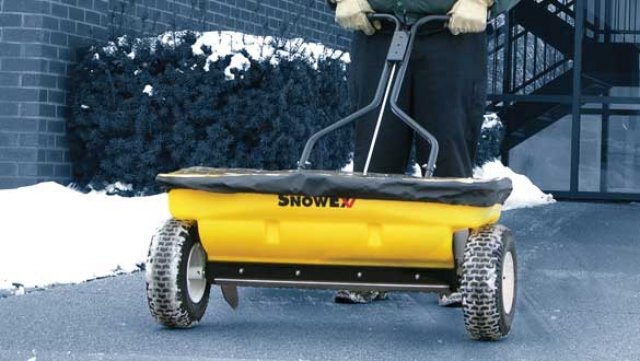 Walk-Behind Drop Spreader SnowEx® walk-behind drop spreaders are perfect for melting ice in confined areas. Offering 160-pound capacities, each unit spreads in a 28-inch-wide path, making them ideal for applying bagged rock salt or pelletized material to sidewalks, driveways and other tight applications. Precise Material Control Unlike broadcast spreaders that distribute material with a spinner, the drop spreaders deliver a consistent flow of material directly to the ground, reducing waste and preventing material from flinging into unwanted locations. | |||||||||||||||||||||||||||||||||||||||