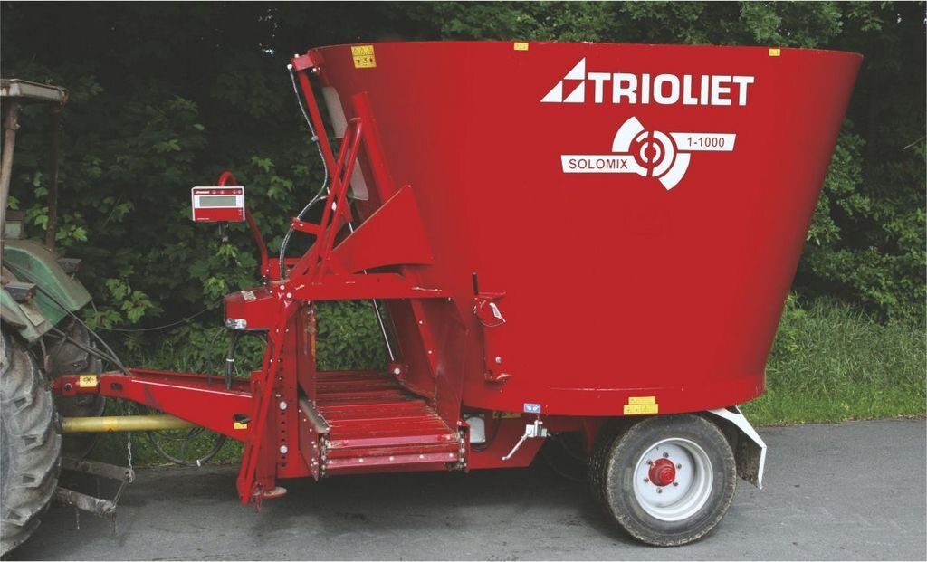 Solomix 1 VLH Feed mixer The Solomix 1 VLH-B is a compact diet feeder, featuring a single vertical auger and a cross conveyor belt in the front. The mixer wagon is also available with a curved (C) cross conveyor chain (K). This trailed TMR mixer is suitable for both large and small scale livestock breeders and is available in volumes from 280-500 cu.ft. The Trioform auger knives are mounted at horizontal position on the auger flighting. This ensures an optimum cutting performance with less resistance in the feed (fuel saving). The patented Trioform auger knives are self-sharpening and the special shape lead up to a higher strength and long life. Its specific characteristics and high quality make the mixer feeder wagon unique, efficient and very easy to work with. Click here to learn about all the unique Solomix features. |