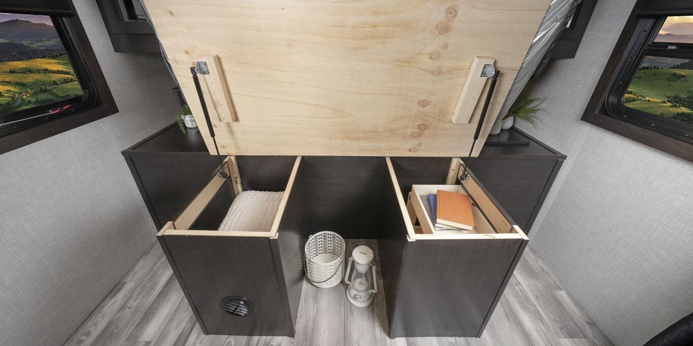 • Oversized pass-through storage with motion lighting