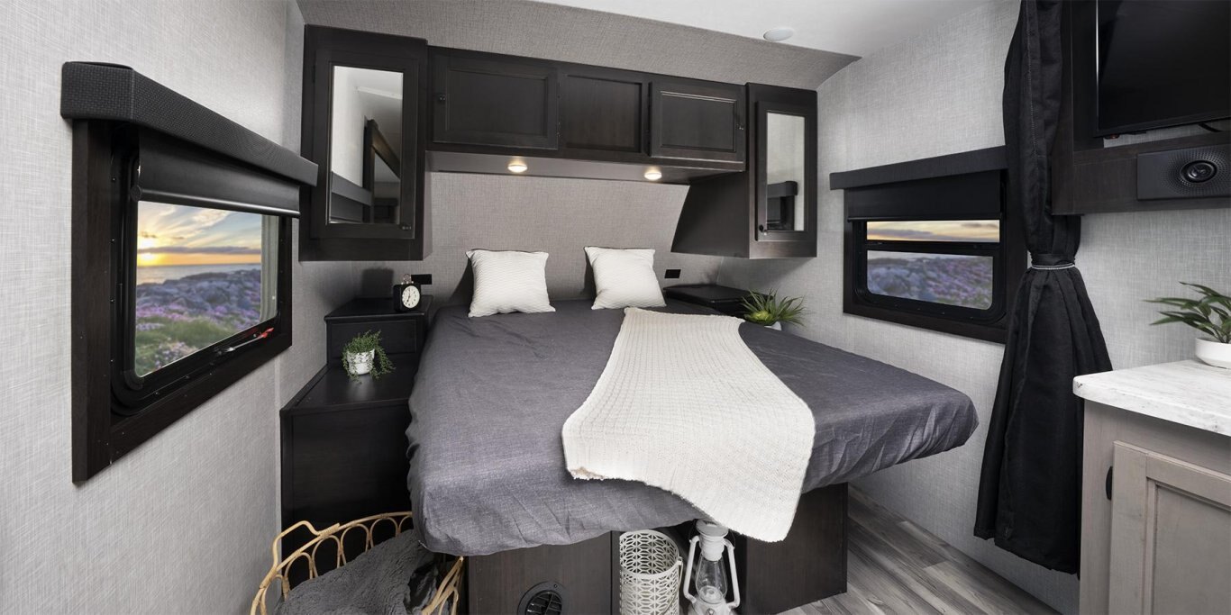 The Super Lite Travel Trailer is kid and pet friendly, starting with the residential vinyl flooring throughout. Tuffshell™ fiberglass walls and a molded front cap make for sleek styling at a lighter weight. Inside, the JBL™ stereo system and blackout roller night shades create a comfortable environment for all your camping trips.