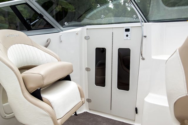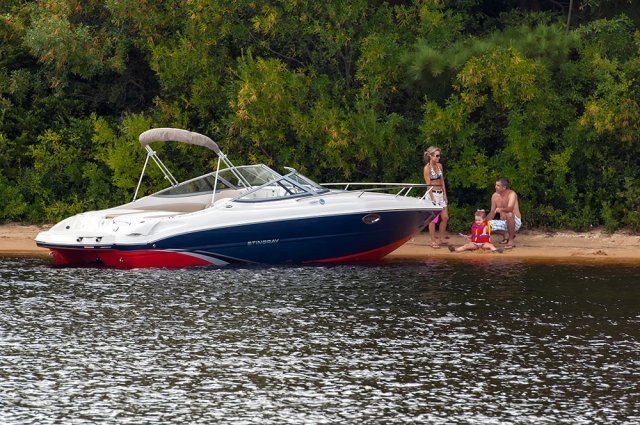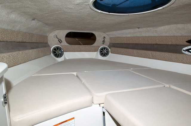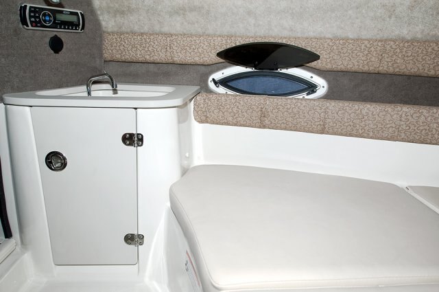 | A deep boat with ample freeboard for "big" water, the 225CR offers both safety and performance. Stingray's Z-plane hull allows it to get out of the water and on plane quicker for faster speeds and a freer riding hull. At just under 23 feet and with a beam of 100 inches, the spacious cockpit and cabin of the 225CR make it a great boat for comfortable overnighting. A recessed cabin step leads to the spacious V-berth and amenities, and the bi-fold doors with smoke inserts and keyed entry lock provide privacy. |