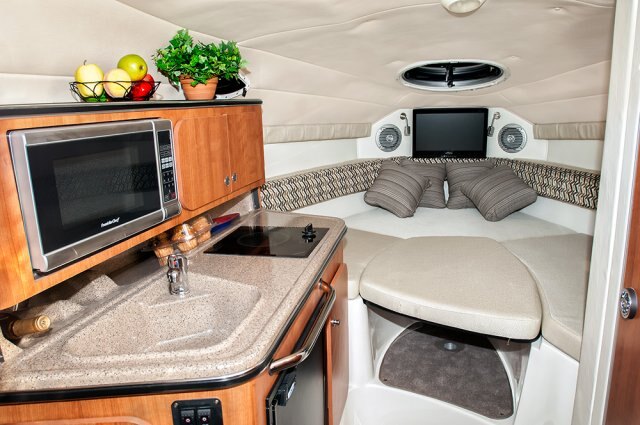 | This dual-cabin cruiser features sleeping accommodations for four with two berths—one in the forward bow and another midships—making it ideal for overnight excursions. Just below deck is a fully equipped galley, and the forward berth converts to a dining area. A fully enclosed standup head includes mirror, overhead lighting, generous storage, sink, manual-flush toilet, and shower. Lots of space, numerous standard features, many options to choose from, and the 250CS is still easily trailerable to endless destinations. |