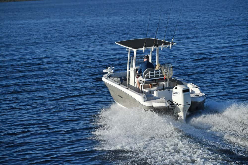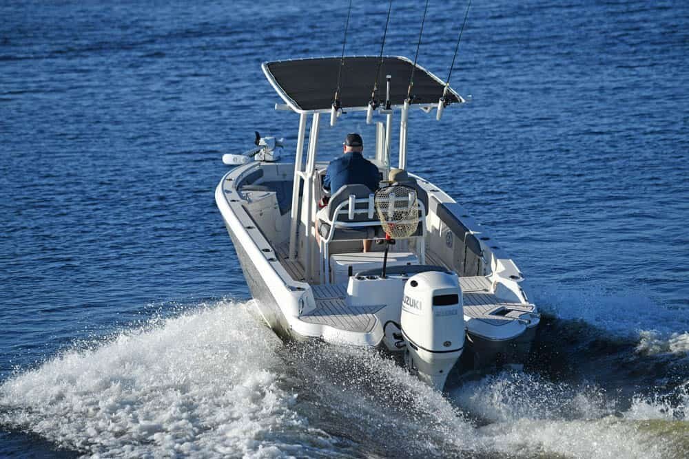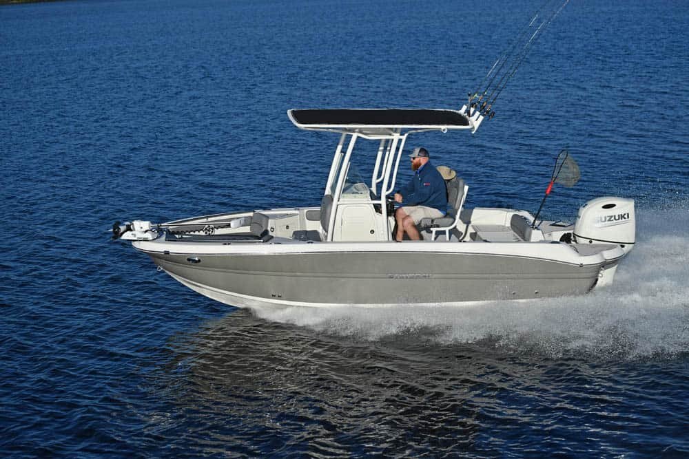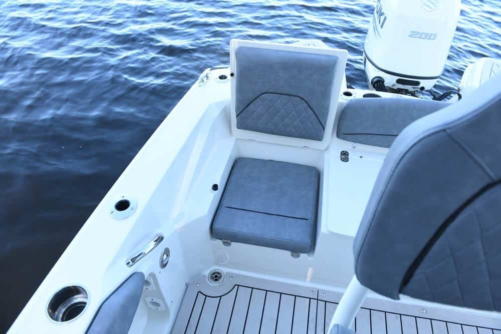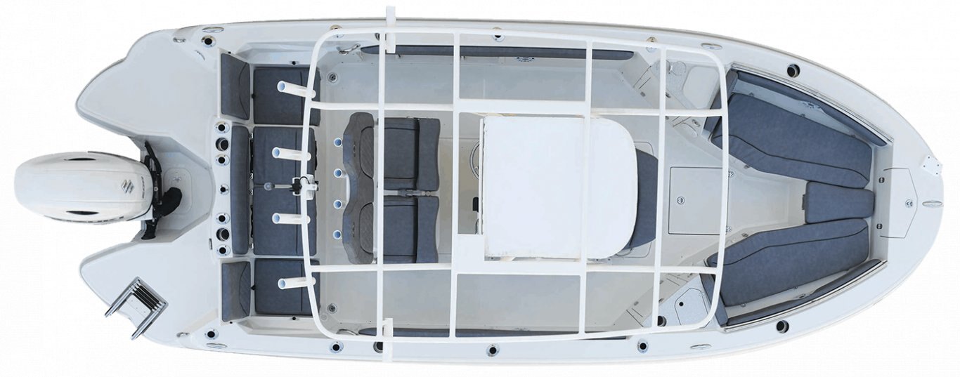 Whether fisherman or family, this boat offers a little something for everyone. Let's start with the anglers. The first thing you will notice is all the rod holders — twelve are standard, not including the molded-in rod storage in the gunnels. Add the optional canvas t-top and you get eight more. The bow cushions can be removed and the rear seats folded down to serve as bow and stern casting platforms. A bow fishing seat and pedestal is optional. At the helm is a leaning post, 74-quart Engel cooler, real tempered glass windshield, and a large flat space for GARMIN electronics. A 14-gallon stern live well is standard, and the front bow cooler can be upgraded to a second live well. A trolling motor mount and harness are also optional. The optional raw water wash-down, along with a self-bailing cockpit and optional seagrass flooring, makes cleanup a breeze at the end of the day.