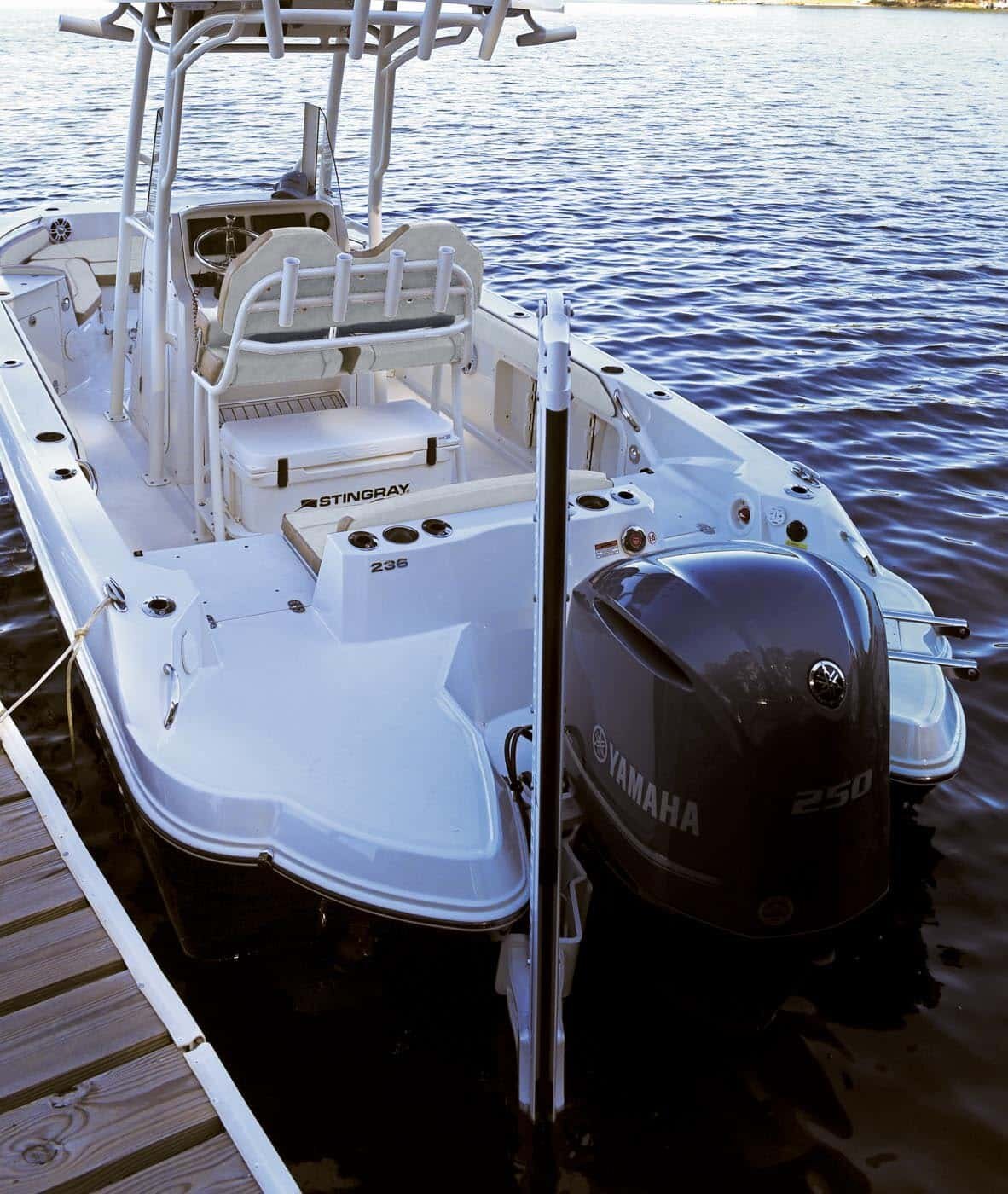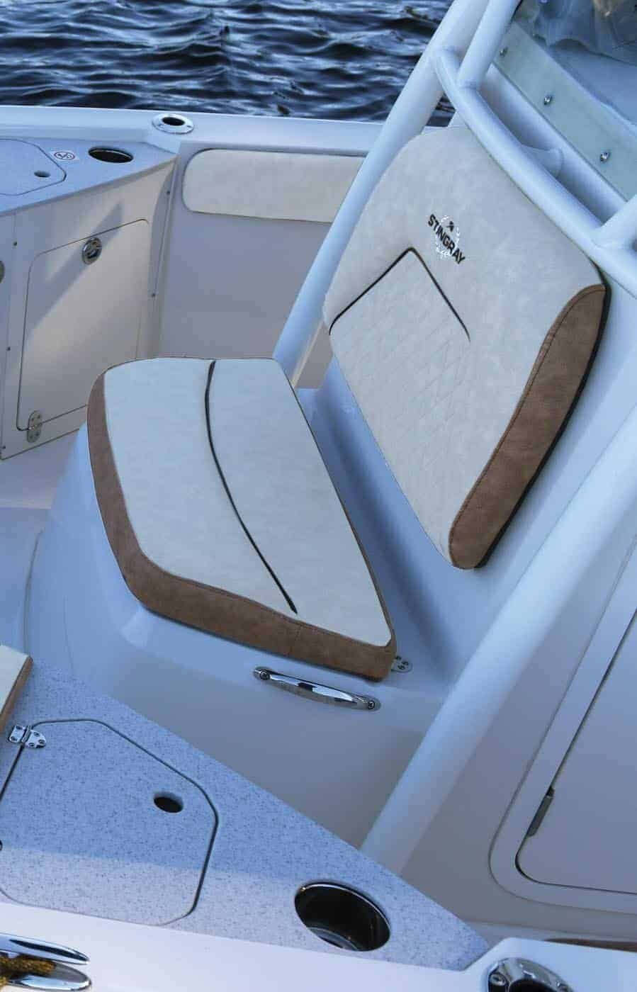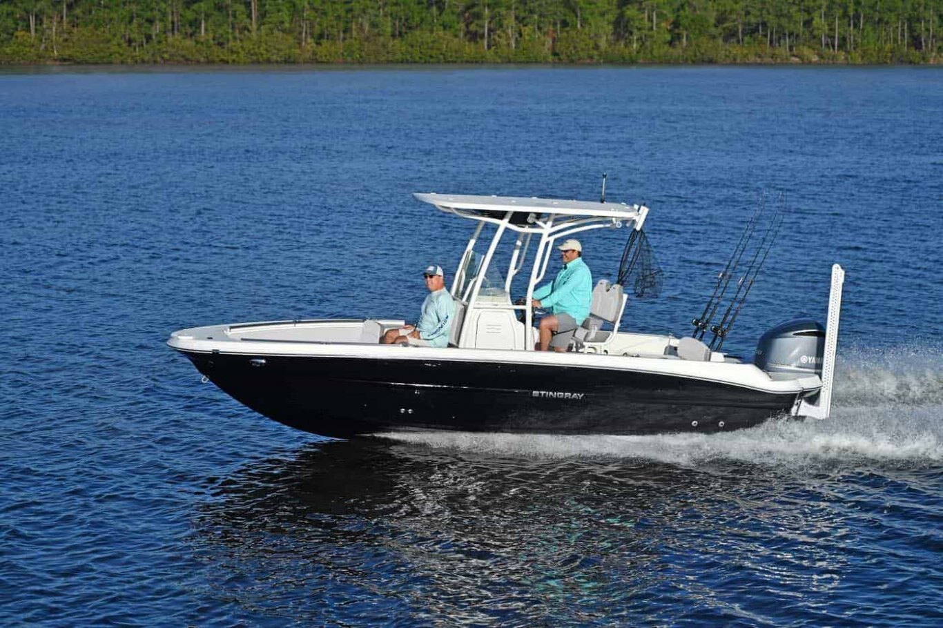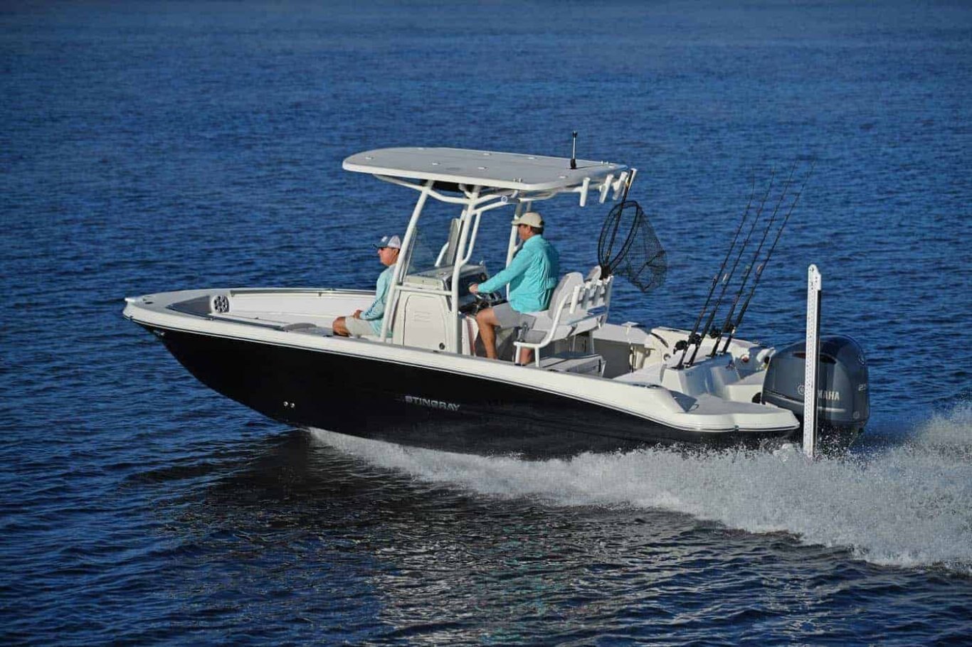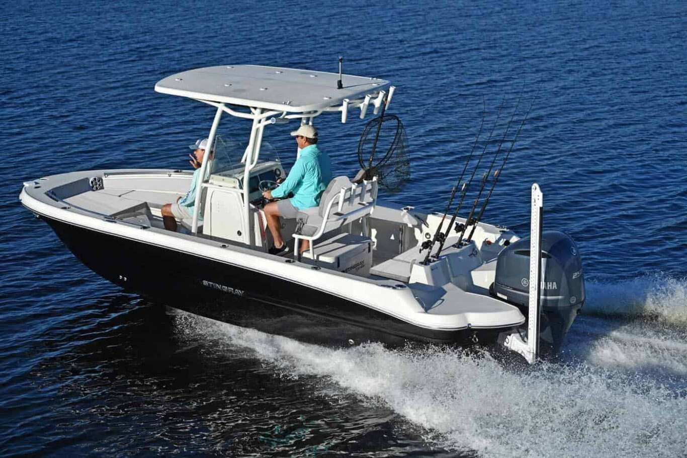 Call Your Fishing Buddies Now!While the 236CC is designed for use as a coastal fishing boat, it's really a multi-purpose boat that can be used for a multitude of activities -- pulling kids on a tube, cruising to dinner, or just a leisurely ride along the waterways. Most noticeable, as you approach the 236CC, is the leaning post, outfitted with custom molded flip-up bolster seats and a 74-quart Engel cooler beneath, and the optional T-top. These features alone set it apart from its little brothers. Add a few options and this boat is ready for some coastal fishing. Go ahead and call your fishing buddies now! Fishing rods and accessories are easily accessible thanks to abundant rod storage around the boat, including molded-in gunnel storage port and starboard, built-in holders on the leaning post, holders at the stern, and holders built into the optional T-top. For a day out with family and friends, the 236CC offers lots of space for maneuvering about, plus seating for up to 12 passengers. To ensure that the deck area is uncluttered, STINGRAY designers effectively made use of all the space on board to incorporate lots of storage areas. The two rear flip-down seats make it easy for passengers to enter and exit from either port or starboard. The bow is large and roomy and can be fully outfitted with cushions for kids, or the family dog. Beneath the helm is a large area that can be used as a changing compartment and also upgraded to a head compartment with the addition of the optional porta potti. |