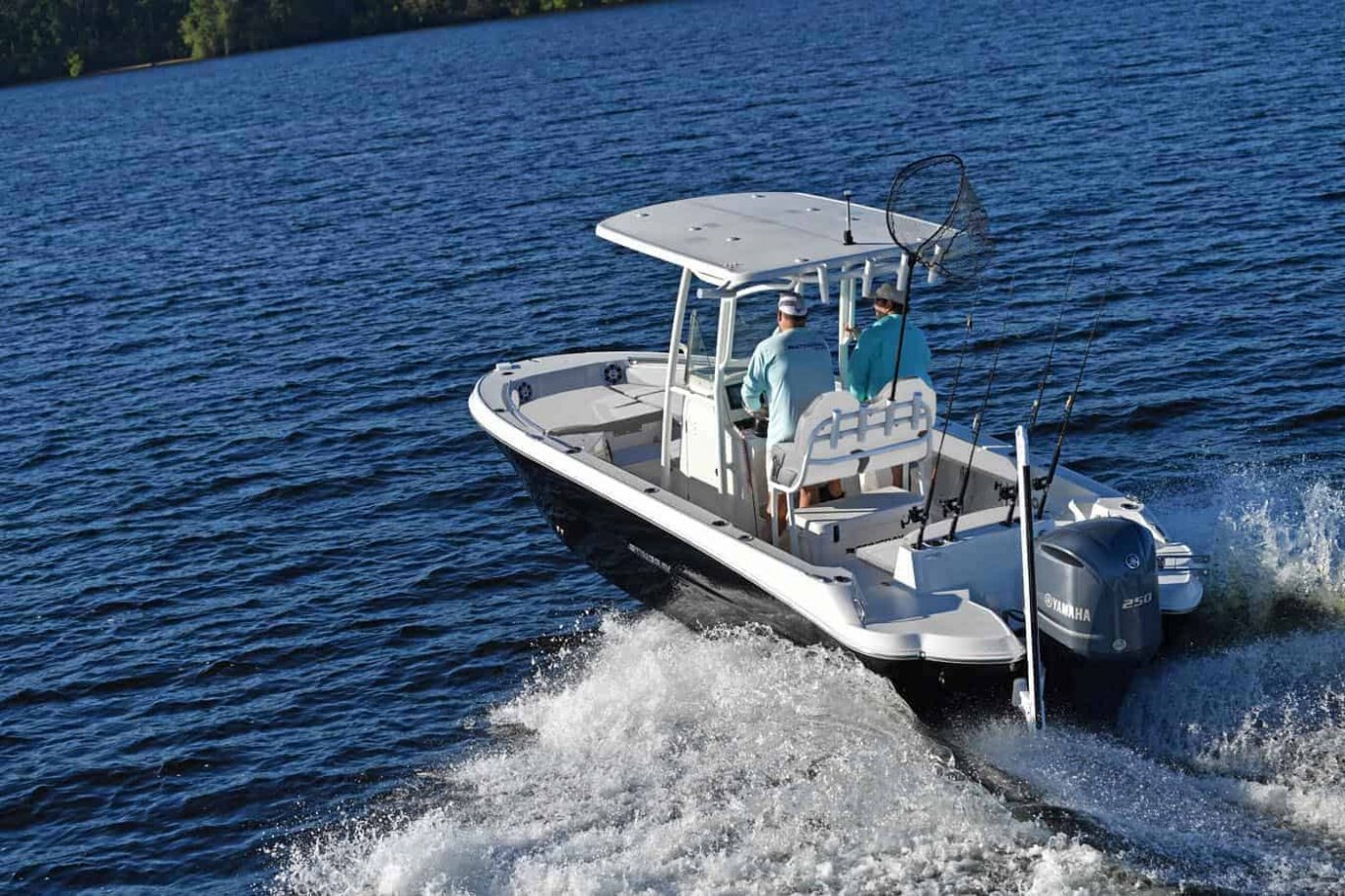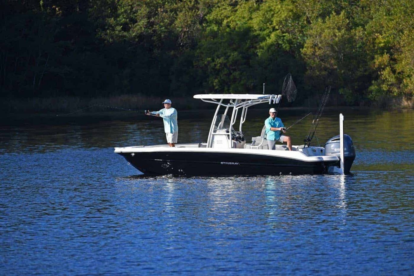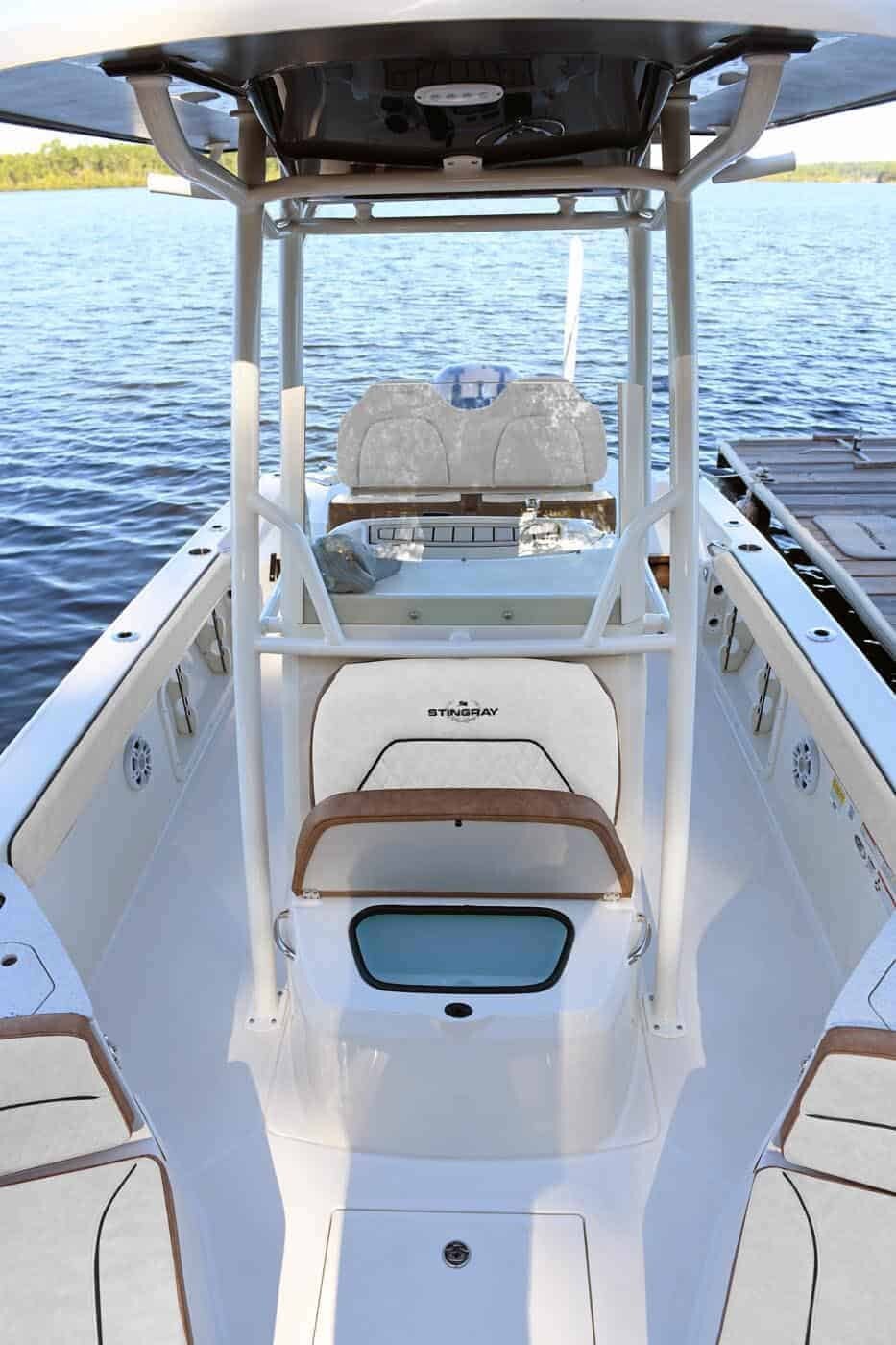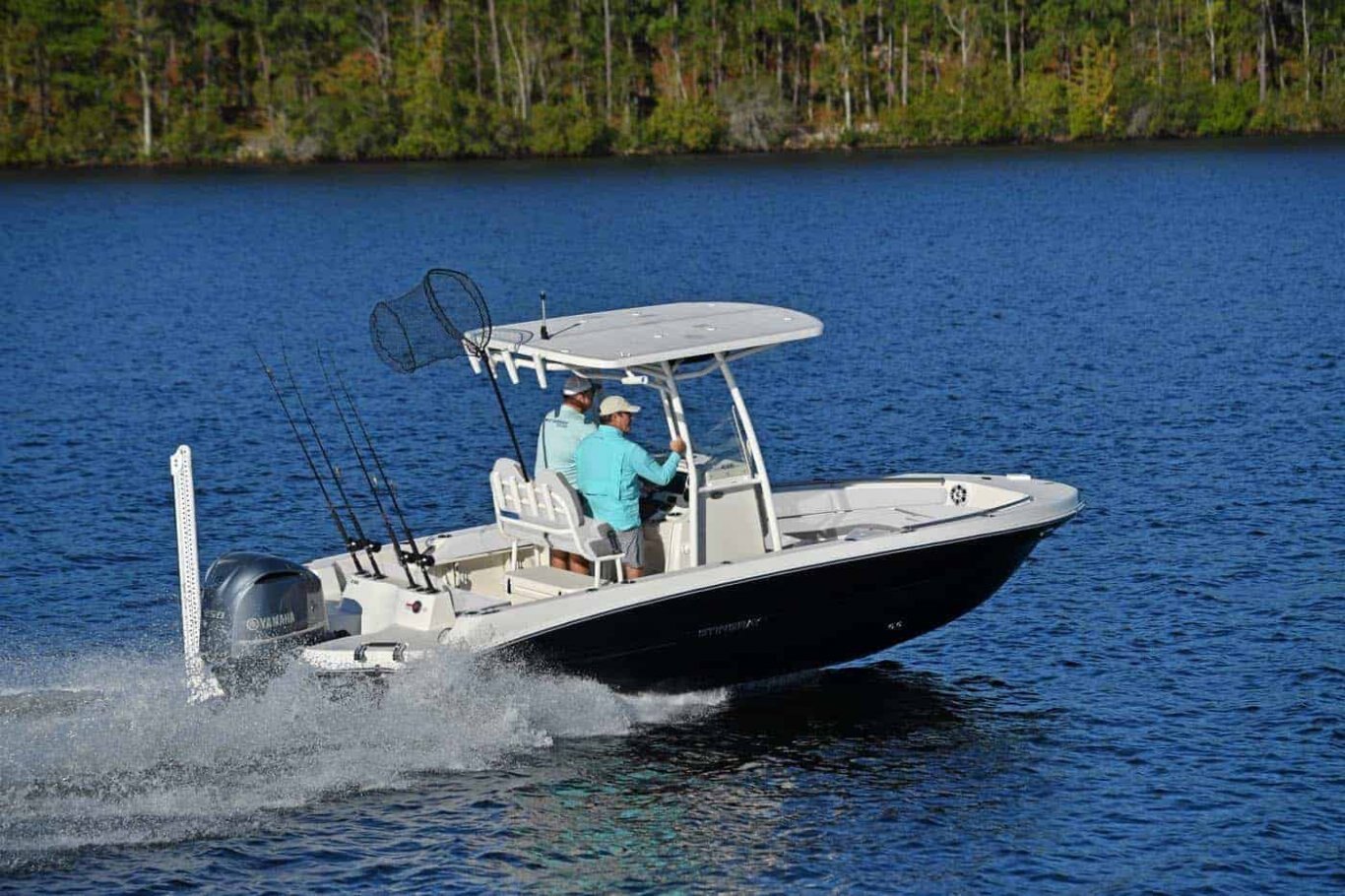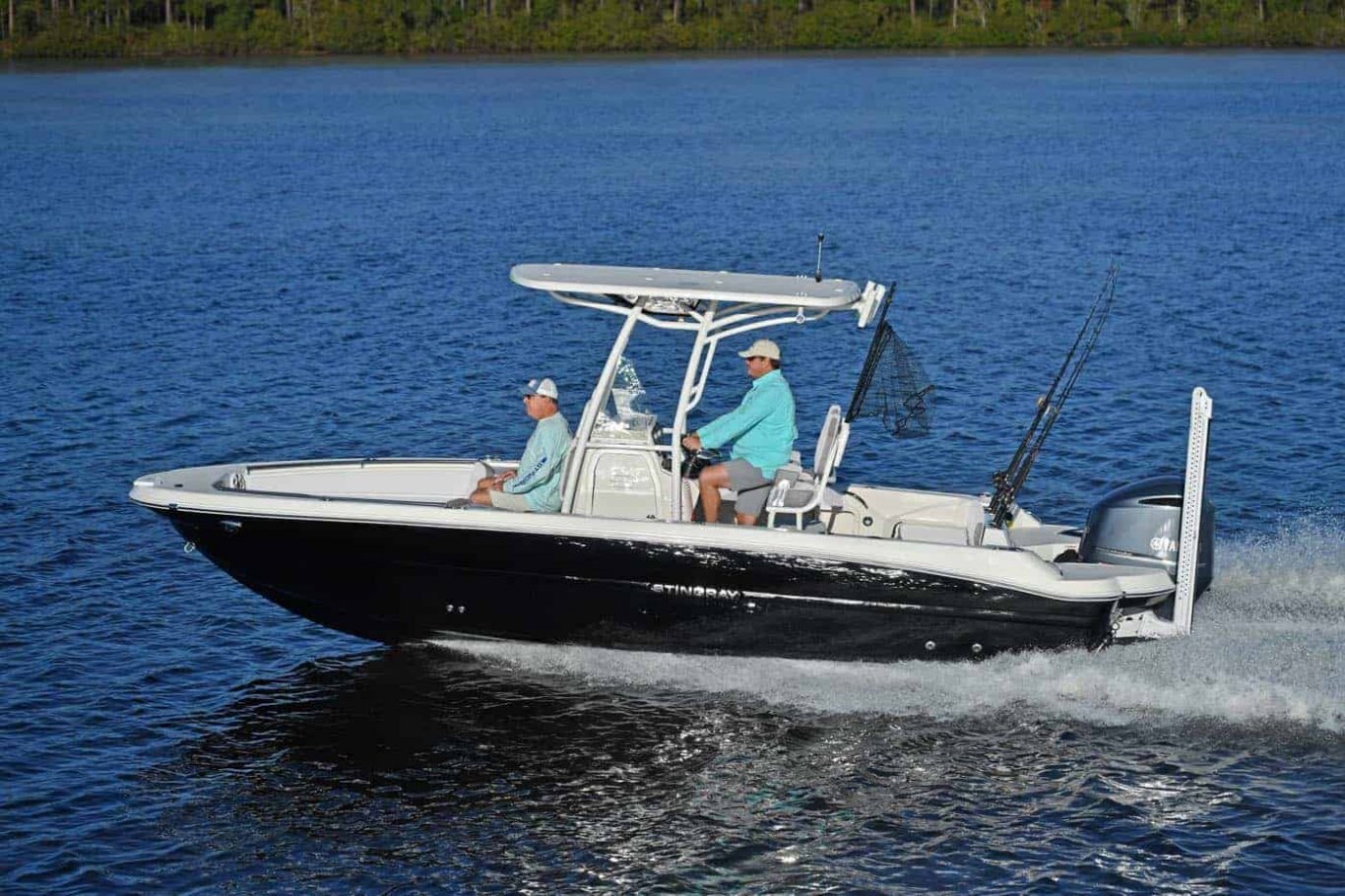 Call Your Fishing Buddies Now!While the 236CC is designed for use as a coastal fishing boat, it's really a multi-purpose boat that can be used for a multitude of activities -- pulling kids on a tube, cruising to dinner, or just a leisurely ride along the waterways. Most noticeable, as you approach the 236CC, is the leaning post, outfitted with custom molded flip-up bolster seats and a 74-quart Engel cooler beneath, and the optional T-top. These features alone set it apart from its little brothers. Add a few options and this boat is ready for some coastal fishing. Go ahead and call your fishing buddies now! Fishing rods and accessories are easily accessible thanks to abundant rod storage around the boat, including molded-in gunnel storage port and starboard, built-in holders on the leaning post, holders at the stern, and holders built into the optional T-top. For a day out with family and friends, the 236CC offers lots of space for maneuvering about, plus seating for up to 12 passengers. To ensure that the deck area is uncluttered, STINGRAY designers effectively made use of all the space on board to incorporate lots of storage areas. The two rear flip-down seats make it easy for passengers to enter and exit from either port or starboard. The bow is large and roomy and can be fully outfitted with cushions for kids, or the family dog. Beneath the helm is a large area that can be used as a changing compartment and also upgraded to a head compartment with the addition of the optional porta potti. |