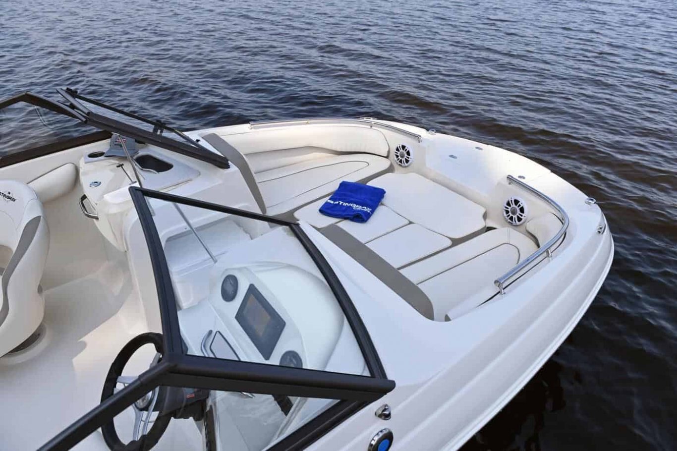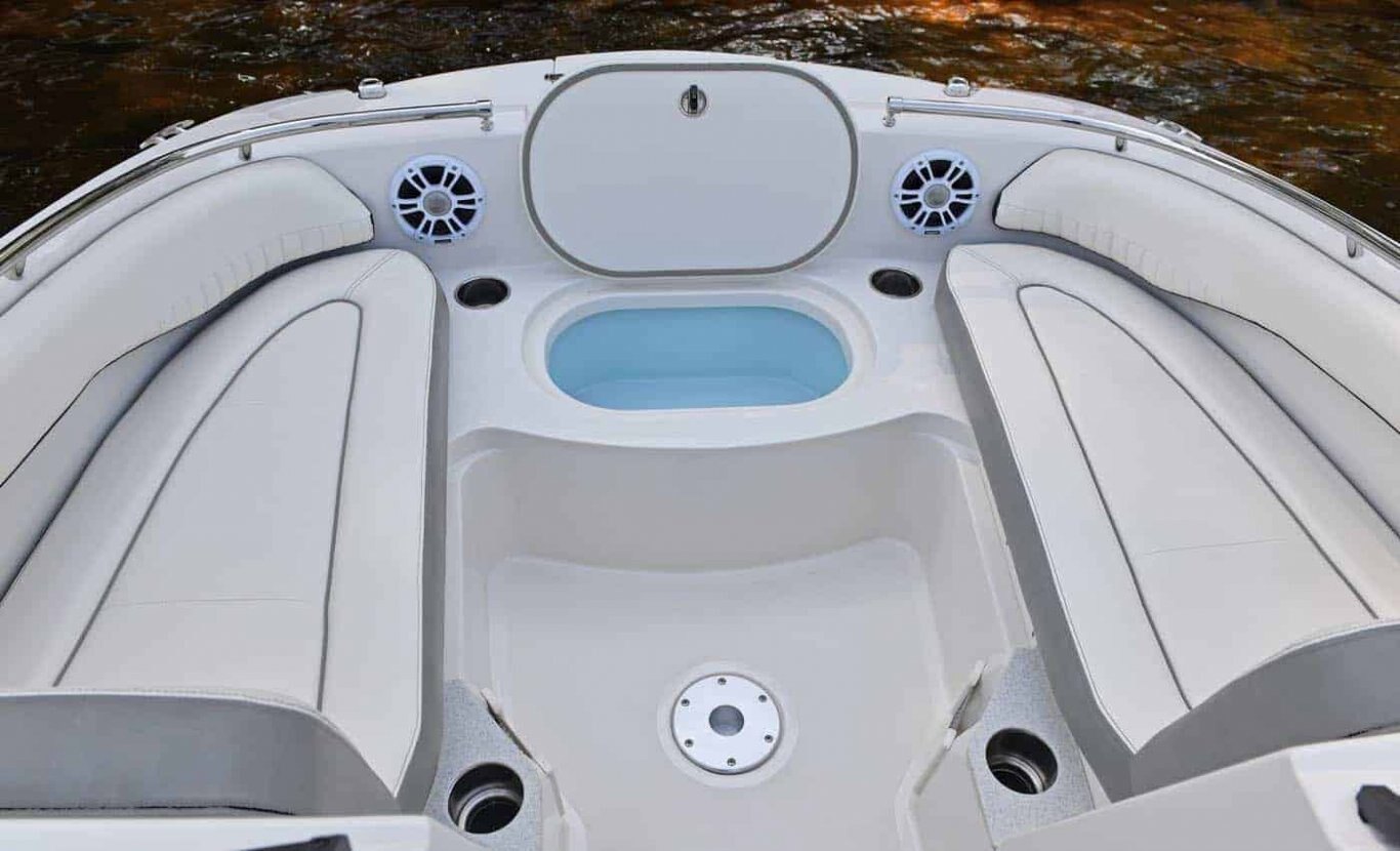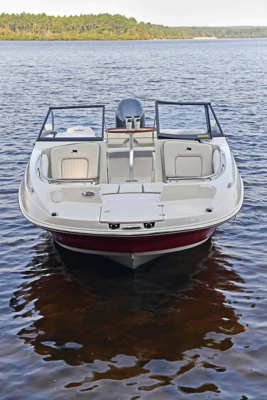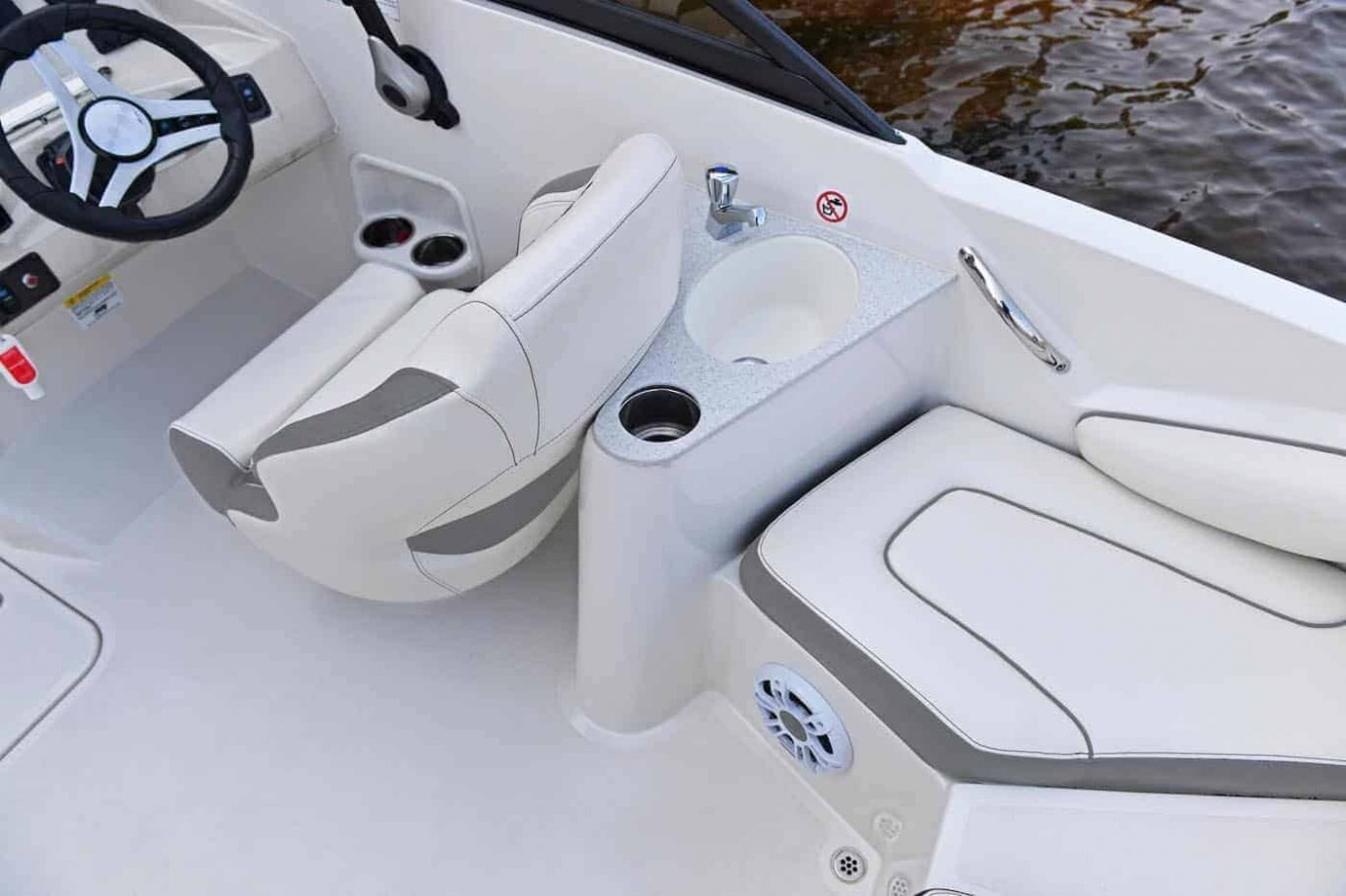 OPEN DECK FEEL WITH A FULL WINDSHIELDIf you love the open feel of a deck boat, but like your boat to have a full windshield, you shouldn't have to choose. The 201DC Dual Console gives you all the interior room and storage space of our 192SC and the added full wrap-around windshield provides a nice shield from the wind while underway. This version gives you two sport bucket seats with bolsters. Deep cockpit and bow areas provide extra safety and security for your passengers. Behind the captain is a solid-surface countertop with a sink and faucet. A mix of dual console deck boat and traditional runabout seating works together to give you a roomy boat with seating for up to 10 passengers. |
