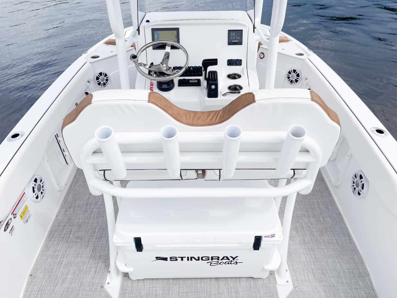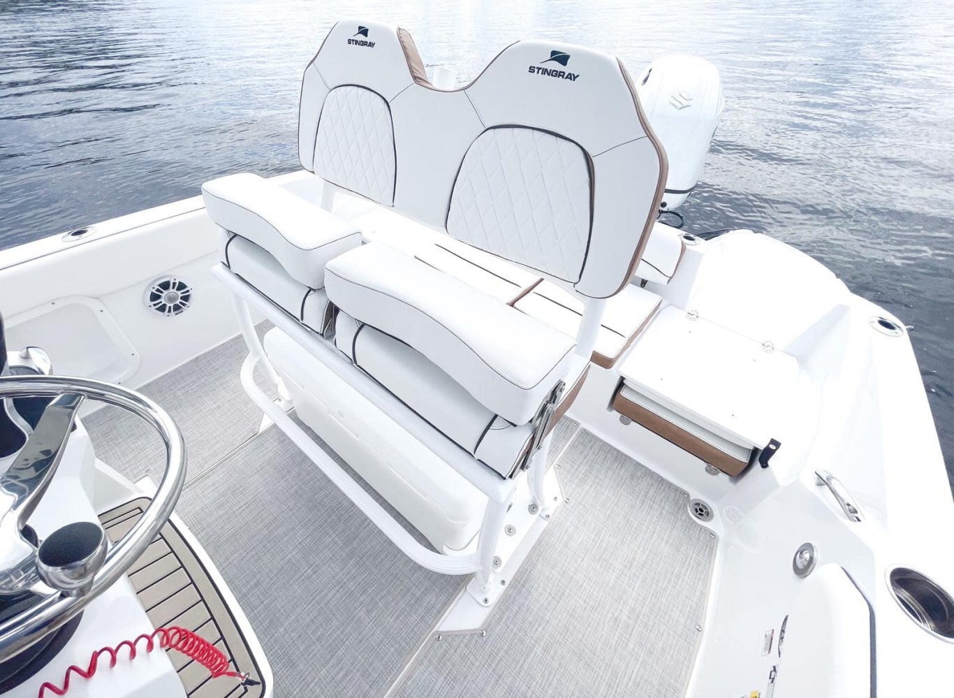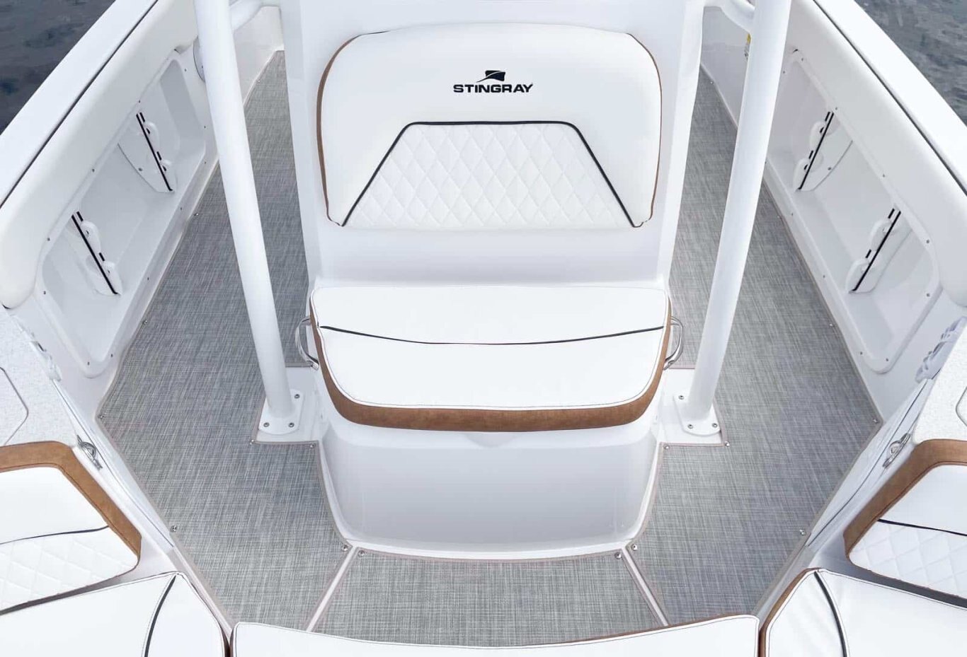 For a day out with the family, it offers lots of space for maneuvering about, plus seating for nine passengers. To ensure that none of the deck area is cluttered when headed out for a day on the water, STINGRAY designers effectively made use of all the space on board to incorporate lots of storage areas around the boat. Beneath the helm is a large area that can be used as a changing compartment and also upgraded to a head compartment with the addition of the optional porta potti. The two rear flip-down seats make it easy for your passengers to enter and exit the boat from either port or starboard.