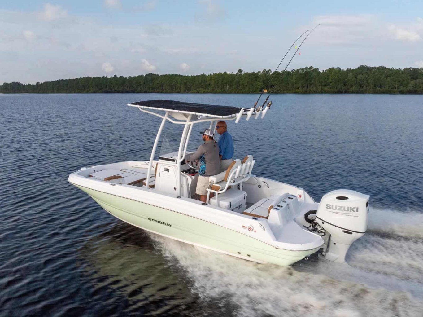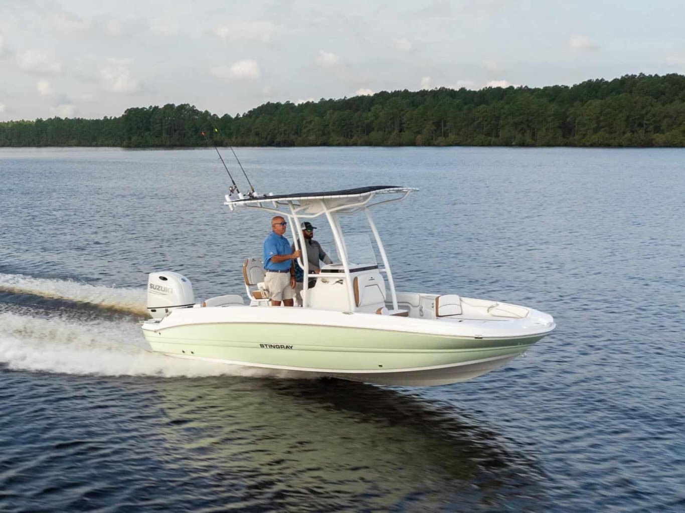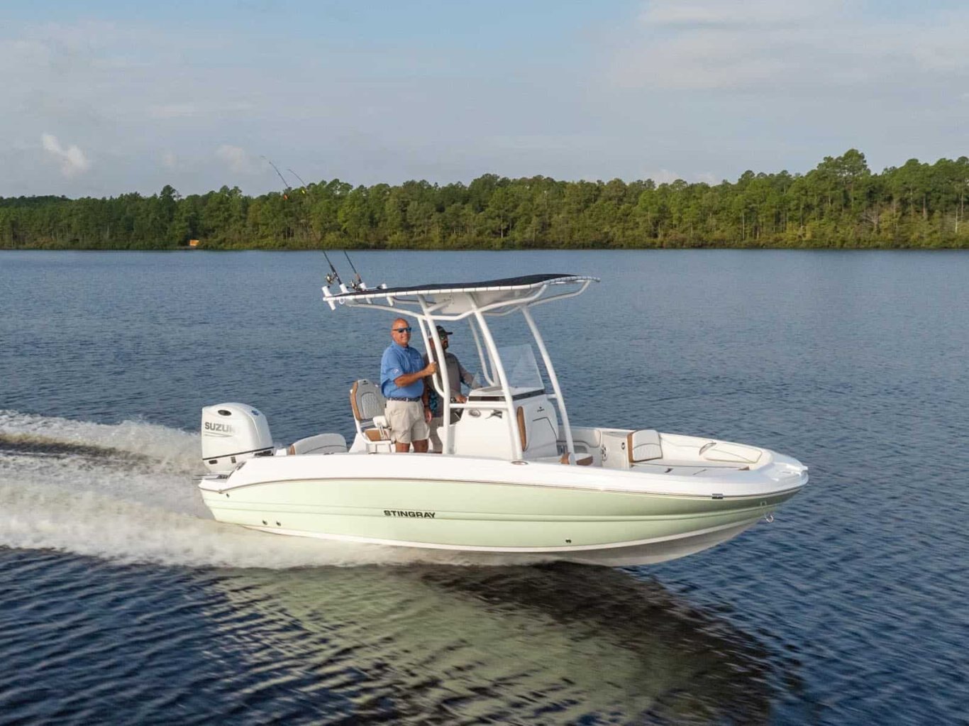 For a day out with the family, it offers lots of space for maneuvering about, plus seating for nine passengers. To ensure that none of the deck area is cluttered when headed out for a day on the water, STINGRAY designers effectively made use of all the space on board to incorporate lots of storage areas around the boat. Beneath the helm is a large area that can be used as a changing compartment and also upgraded to a head compartment with the addition of the optional porta potti. The two rear flip-down seats make it easy for your passengers to enter and exit the boat from either port or starboard.