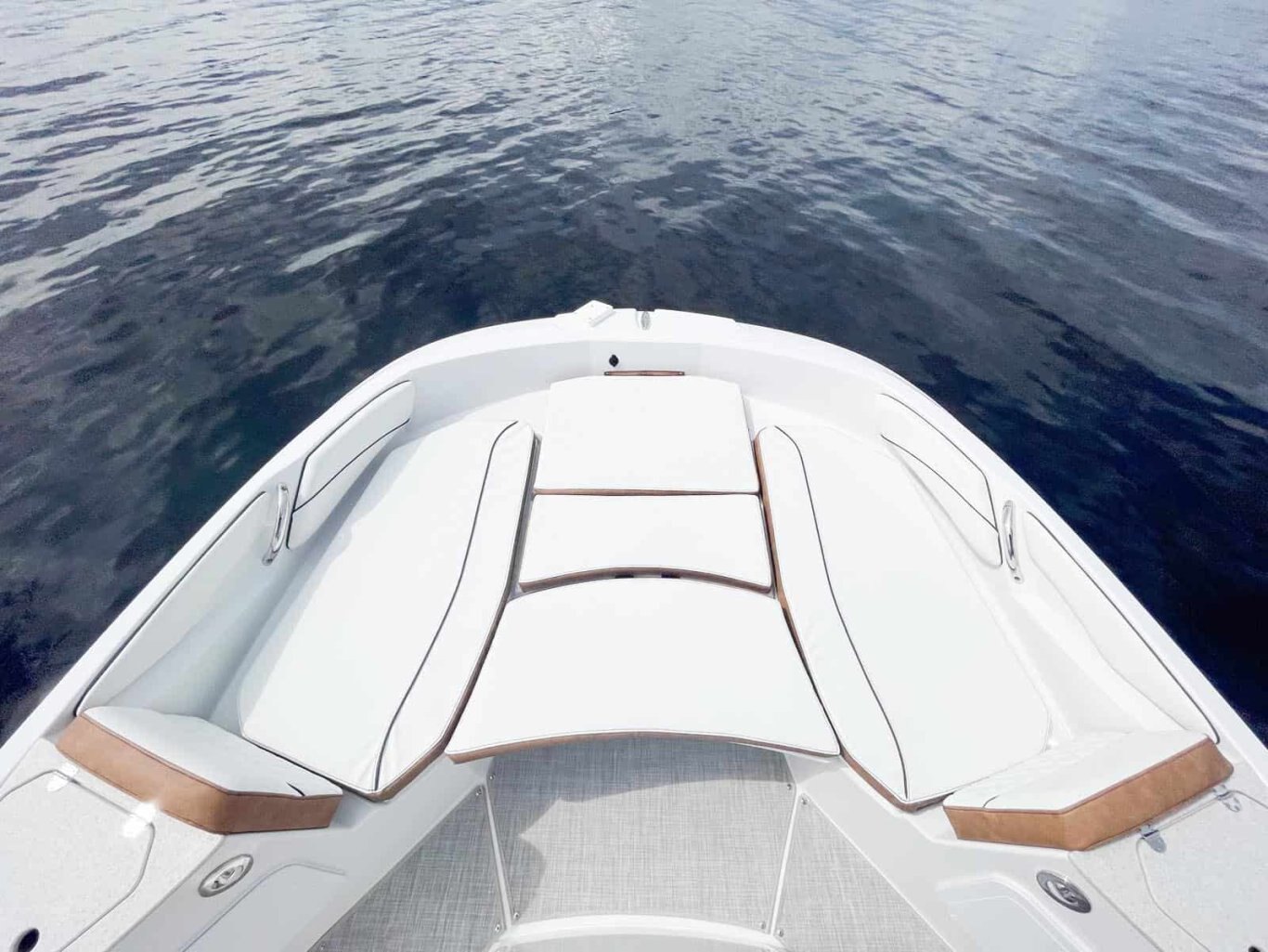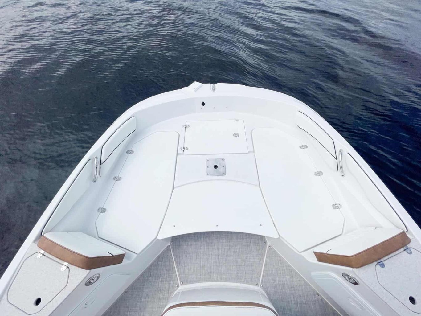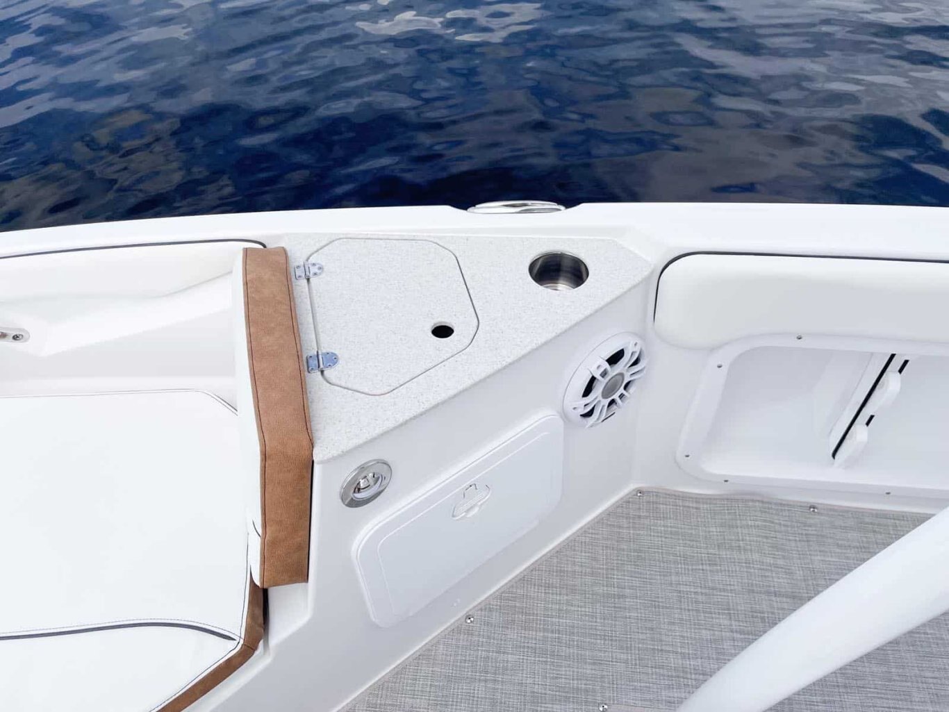 For the anglers, a low profile design makes it easy to navigate in low clearance areas, a helm seat for two has an adjustable seat / leaning post for fishing, a clean dash design leaves room for GARMIN electronics, the main helm seat lifts to reveal a conveniently located 26-gallon live well, and the forward bench offers an 18-gallon cooler that can be upgraded to a live well. The walk-around access, combined with the large foredeck, makes it easy for anglers to quickly move around the boat. Additionally, two rear seats lift up for seating and quickly fold down for use as casting platforms. Fishing rods are easily accessible thanks to abundant rod storage on both sides of the boat.