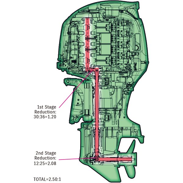 Pioneered by Suzuki, the use of the offset driveshaft on four-stroke outboards has long been utilized to reduce the size of the outboard. Found on all Suzuki four-strokes from the DF70A and up, this design positions the crankshaft in front of the drive shaft simultaneously moving the outboard’s center of gravity forward. While the design contributes greatly to the outboard’s overall compactness and increased power performance, it also moves the engine’s axis of inertia, the point where engine vibrations are at a minimum, up over the upper engine mount, thus greatly reducing vibration. These outboards also incorporate two-stage gear reduction designed to take maximum advantage of the power produced by these high-performance engines. Providing a large final drive ratio, it delivers powerful torque for quick acceleration and great top-end speed.