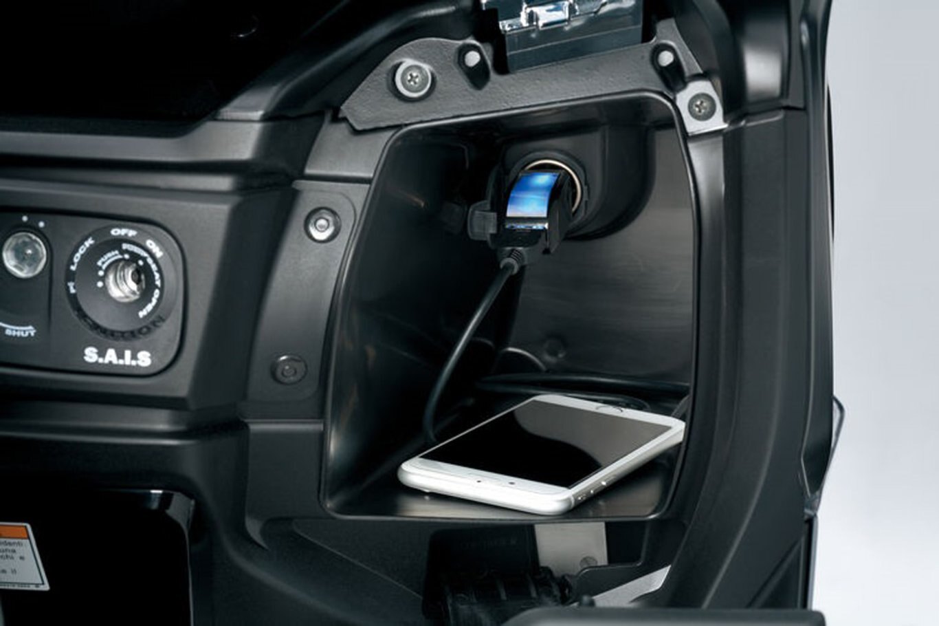 The right storage bay has a 12V DC outlet* for charging your mobile phone or other electronic devices.