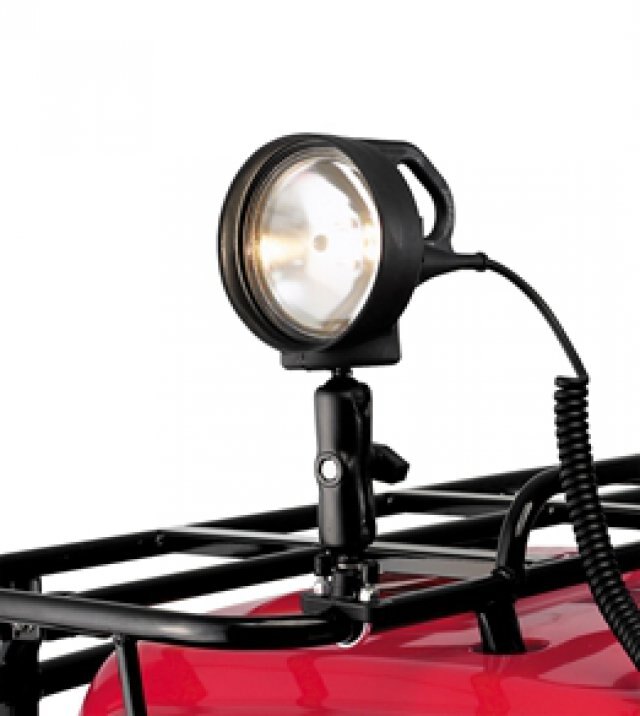 70,000-candle power sealed beam light features include a 10-foot heavy-duty retractable-coiledcord with a power outlet plug connecting to an accessory outlet. Light attaches to the racks usingslip-resistant, double ball and socket mounting system.