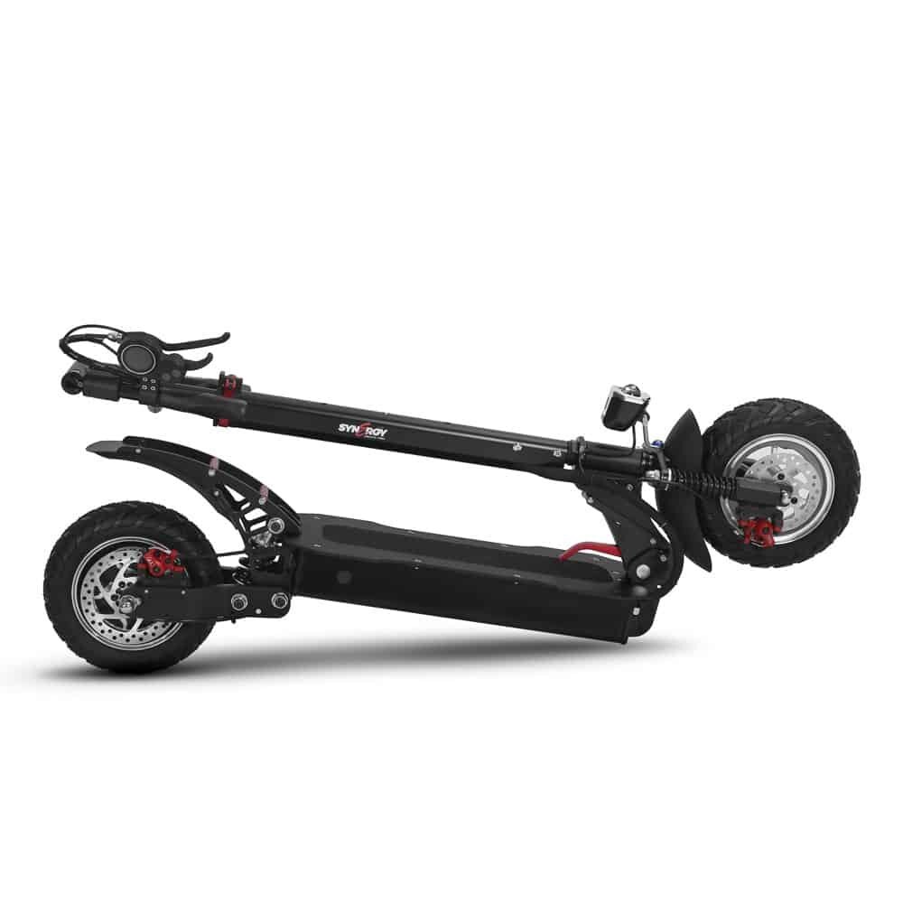 The Synergy Off-Road Sport E-Scooter is equipped with an 2x 800W electric motors, it can reach speeds of 40km/h, and with a range of up to 30-40km (depends on conditions and riders bodyweight). The body of the scooter is Aluminum, and it offers dual suspension as well as hand-actuated front and back disc brakes, plus electric brakes. The Sport Dual also features a digital display of speed and battery charge. |