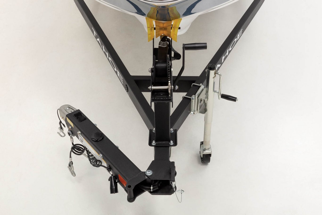 Custom-fit, single-axle trailer powdercoated w/GALVASHIELD® Impact corrosion & chip protection for improved durability Disc brakes Chrome wheels & matching hub covers w/15" (38.1 cm) radial tires Hubs designed for quick & easy hub lubrication Space-saving swing-away tongue Fold-away tongue jack Heavy-duty winch w/nylon strap & bow safety strap Carpeted bunks & fender boards to protect hull Submersible LED lights Safety cables