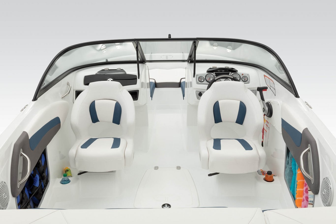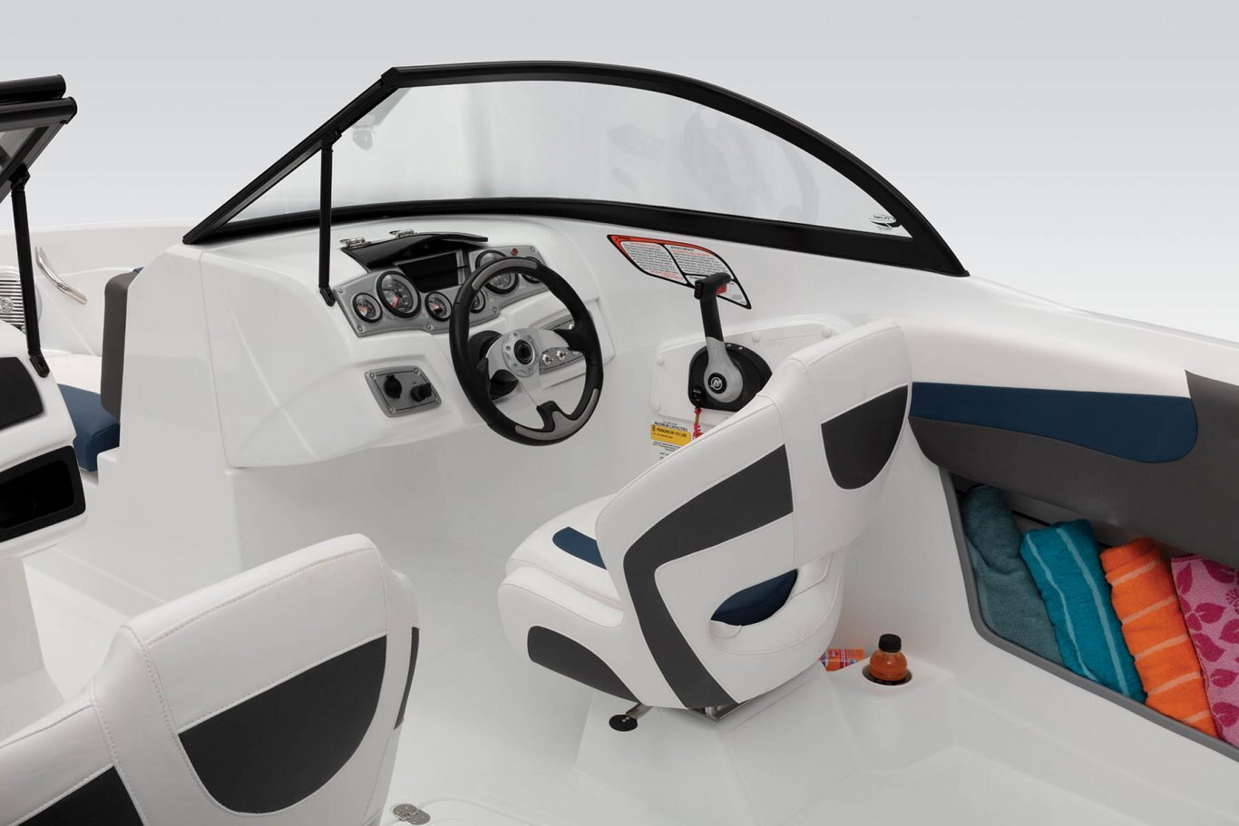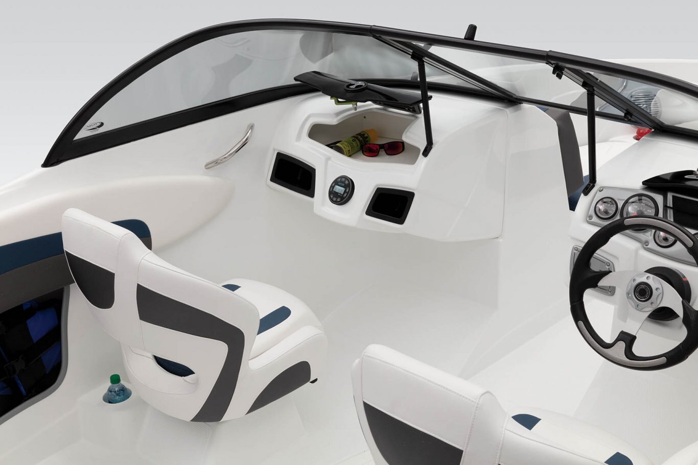 Walk-thru tempered safety glass windshield w/Black powdercoated aluminum frame Molded fiberglass port console w/storage locker & trays Jensen® JMS3 stereo w/Bluetooth®, MP3 input & 4 speakers Helm console w/speedometer, tachometer, fuel gauge, trim gauge, oil pressure gauge & engine temperature gauge Sport steering wheel Power steering Water-resistant toggle switches Starboard storage for electronic device
