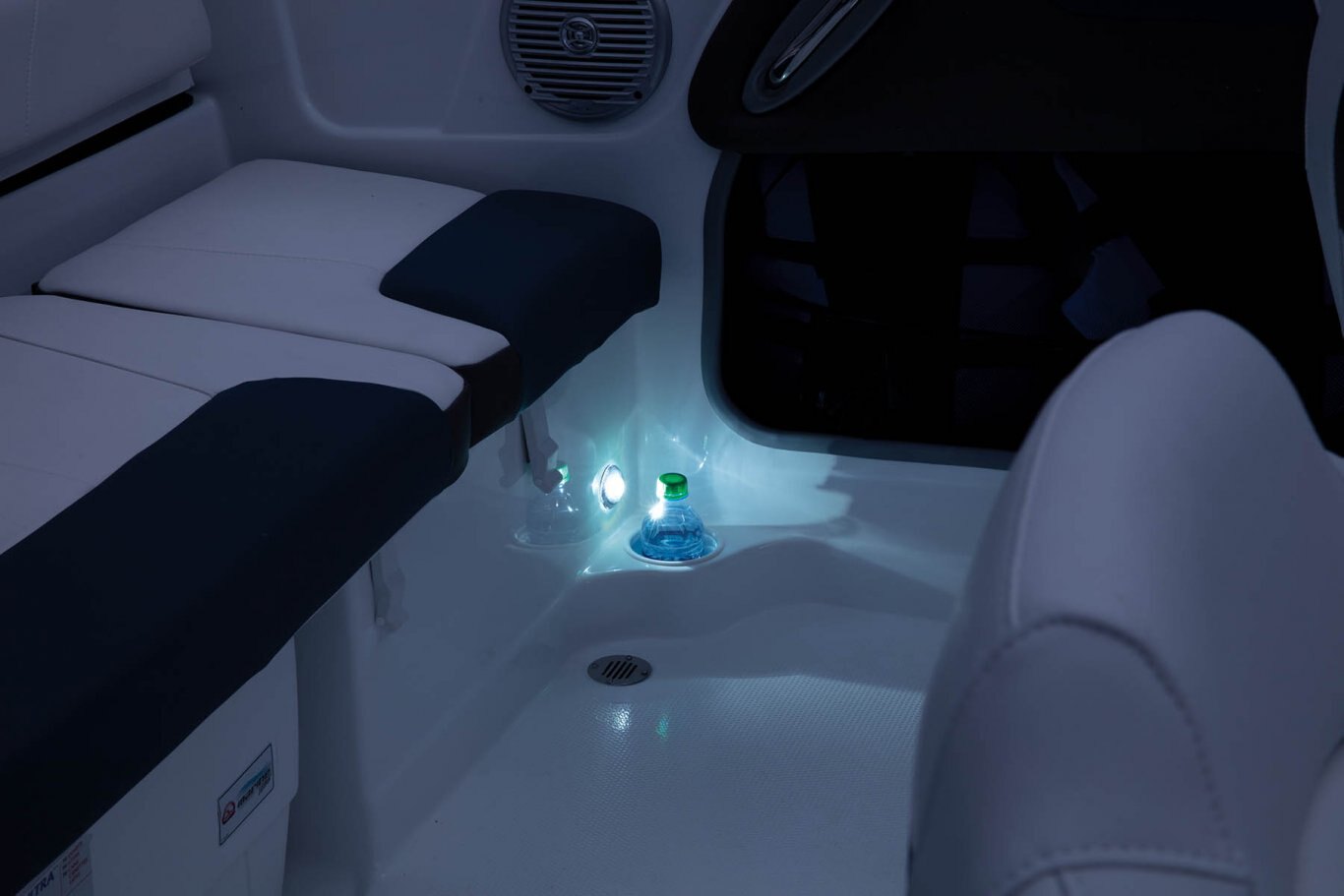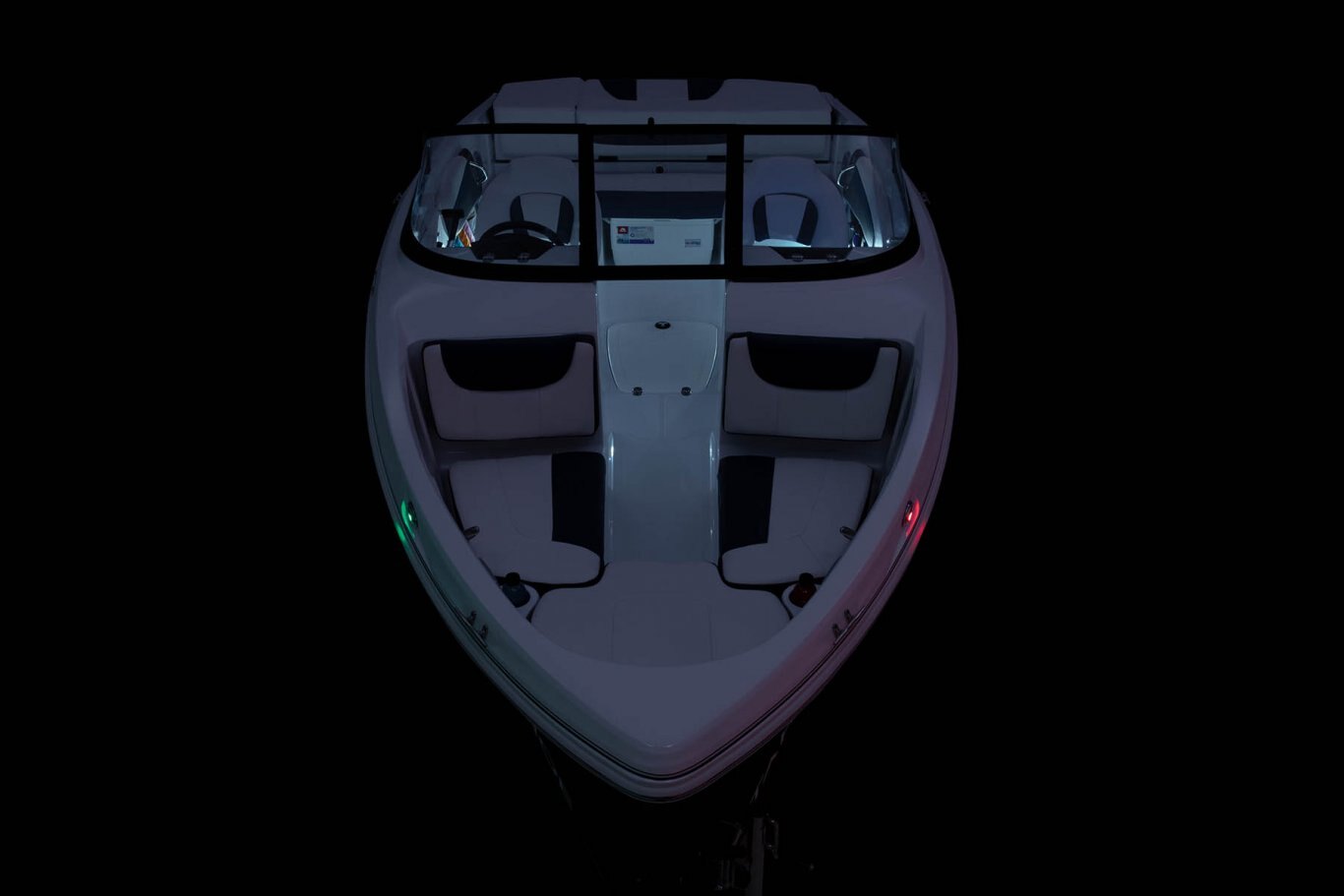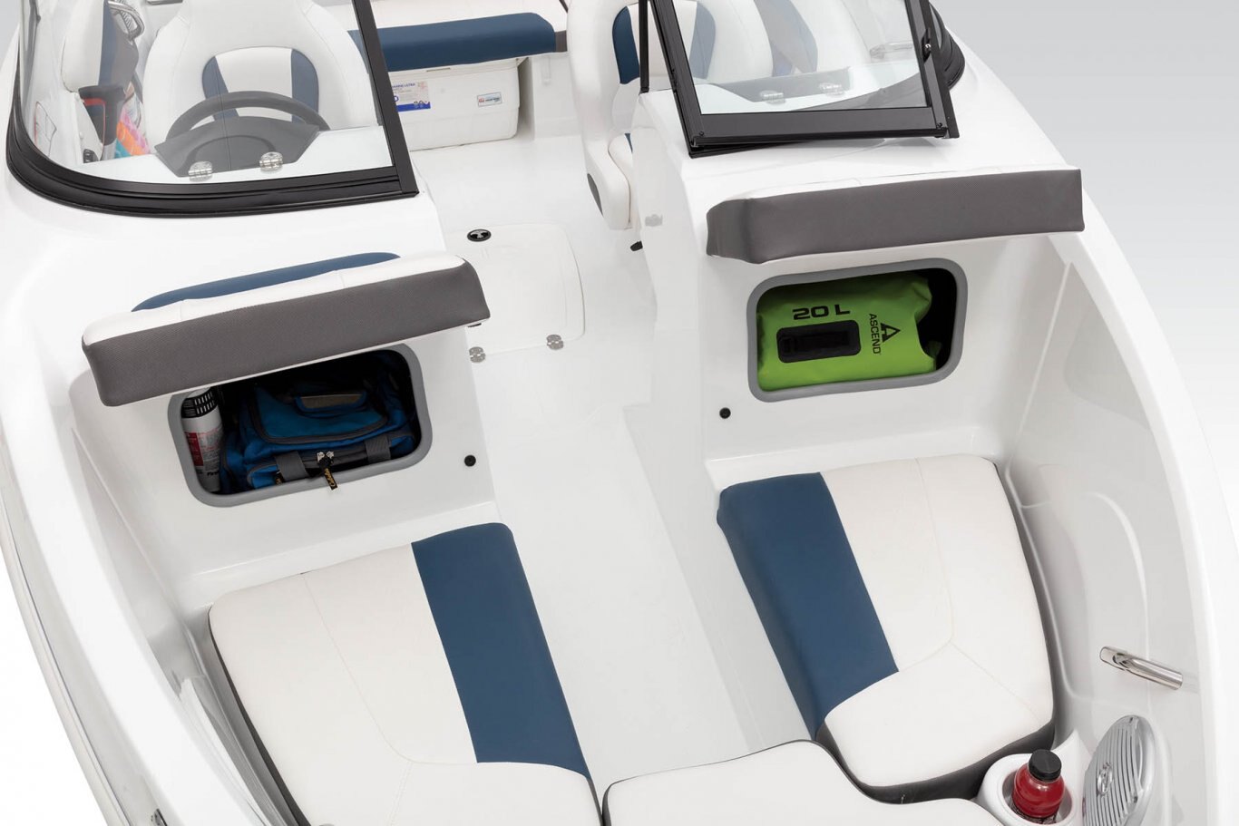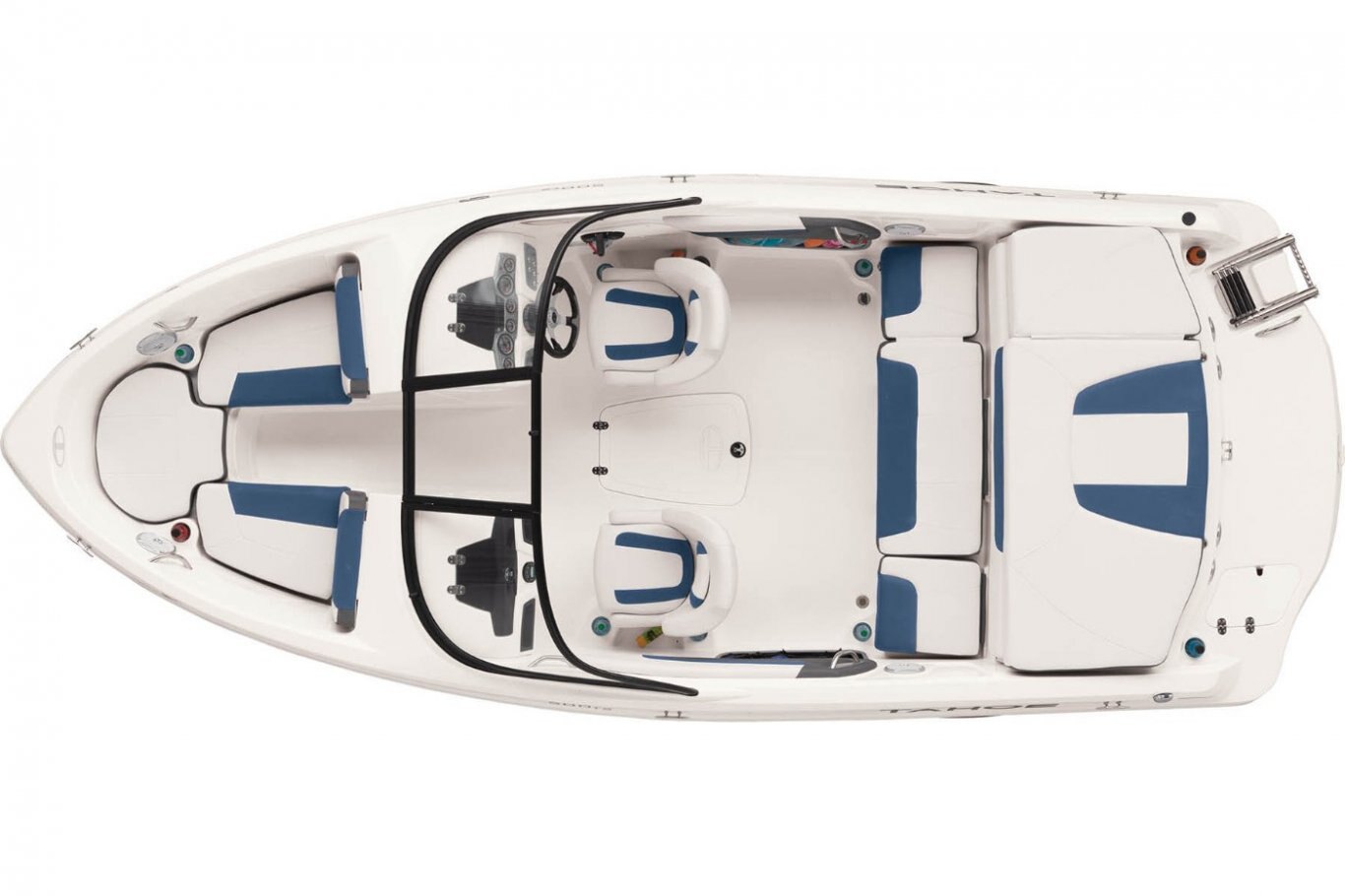 Non-skid fiberglass floor 29-oz. (.82 kg) expanded polyester-back marine-grade UV-resistant upholstery w/color-keyed accents & stain-resistant top coating Anchor locker Bow lounge seating w/molded-in storage below Bow port & starboard backrests flip up to provide access to console storage Adjustable driver & passenger bucket seats w/slide & swivel Port & starboard side storage Port & starboard floor-level small items recesses In-floor wakeboard/ski storage compartment w/hold-open lid assist Cockpit side storage Aft bench seat w/removable 36-qt. (34.07 L) cooler & insulated port & starboard storage compartments Aft full-width padded sundeck w/flip-up cushion for access to step-thru transom, engine compartment storage below & starboard storage Step-thru transom