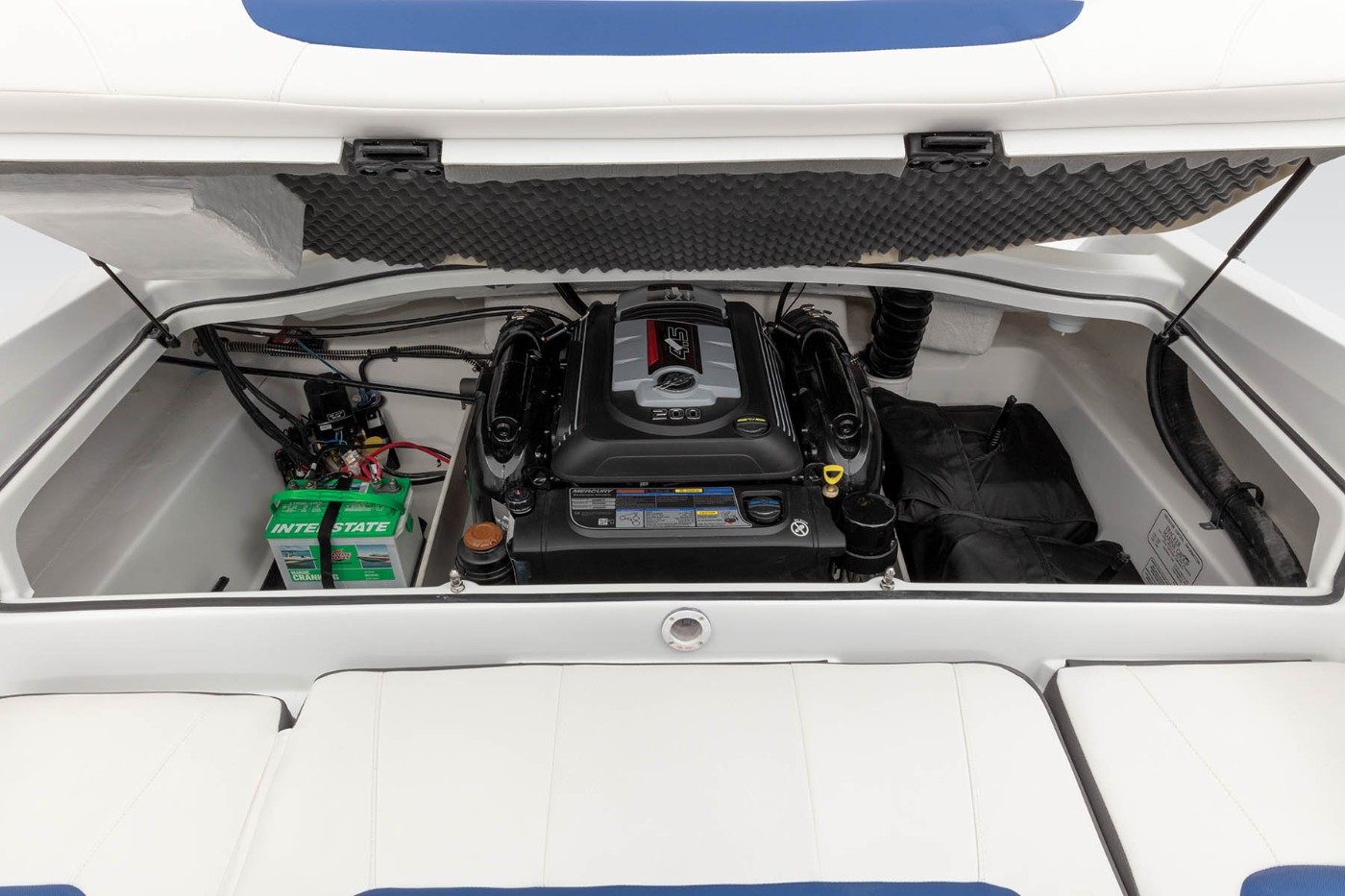 - Aft full-width padded sundeck w/flip-up removable cushion, access to step-thru transom, pedestal fishing seat location, engine compartment storage below & starboard storage