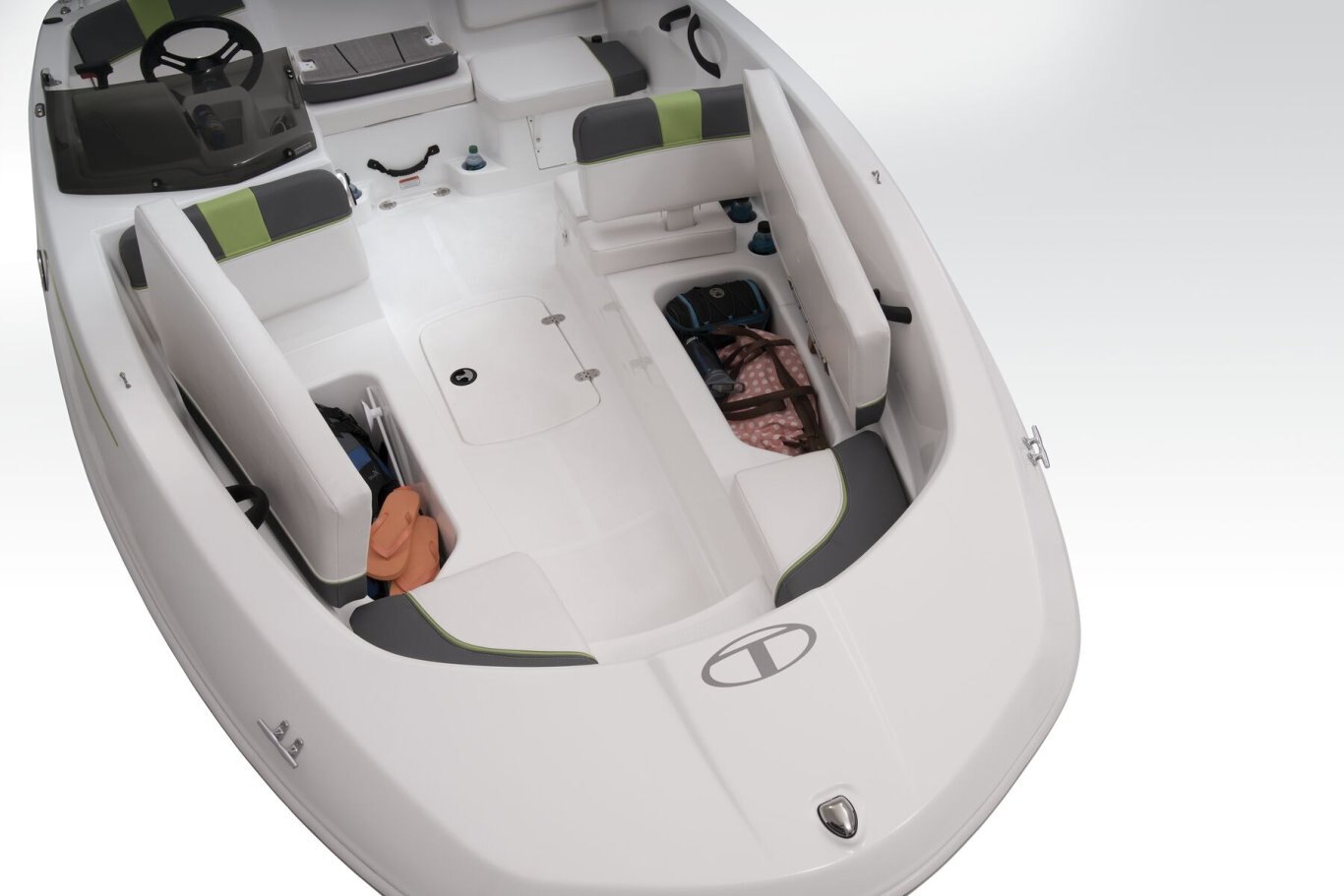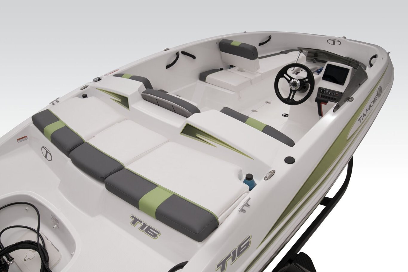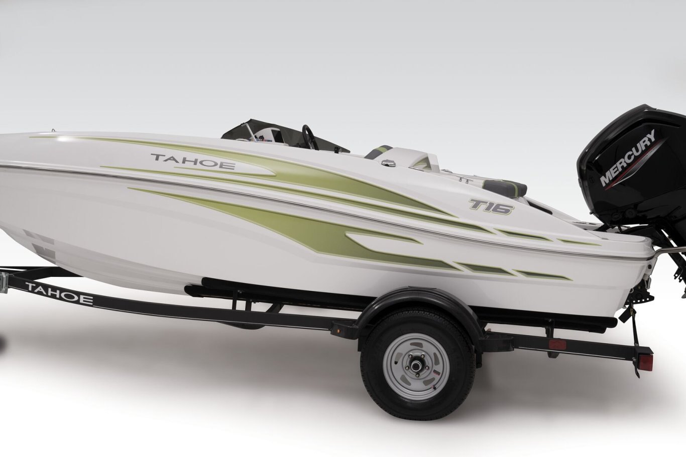 The TAHOE® T16 is fully loaded and priced to deliver huge returns of fun and excitement. A 7” touchscreen multifunction display is standard and displays your GPS-accurate speed, the water depth, as well as your motor’s vitals. Inside, creature comforts abound in the form of twin forward lounges with ample underseat storage, and out back you’ll find a sun pad and a FourStroke Mercury outboard for spirited and economical performance. Rounding out the package is a custom-built trailer for years of on-road peace of mind.