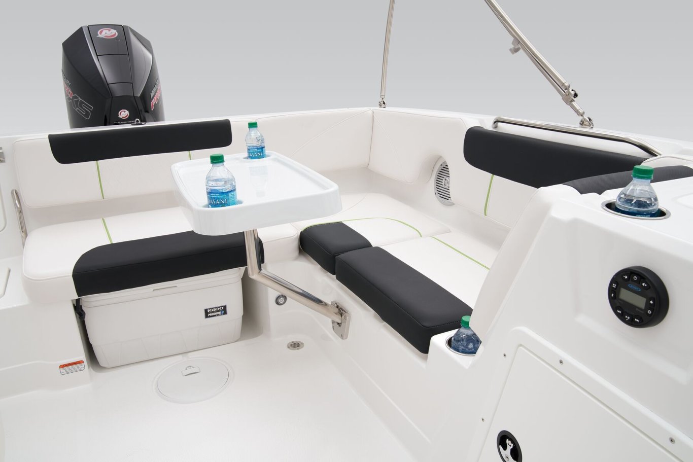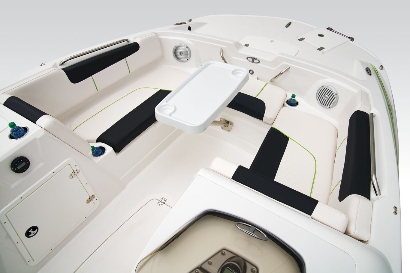 Non-skid finish on fiberglass floor Premium UV-resistant upholstery Wraparound bow lounge seating w/storage below Bow 11.5-gal. (43.53 L) aerated livewell w/500 GPH (1,892.71 LPH) pump, gravity drain, adjustable spray head & dash-mounted switch Port refreshment center w/storage KICKER® stereo w/Bluetooth®, MP3 & USB input & 4 speakers In-floor wakeboard/ski storage compartment w/hold-open lid assist Adjustable driver bucket seat w/slide, swivel & flip-up bolster Aft L-lounge w/storage, tow rope holder & removable 25-qt. (23.66 L) cooler Ski tow pylon storage Aft trash receptacle w/lid & removable insert Removable table w/2 mounting locations Walk-thru transom gate