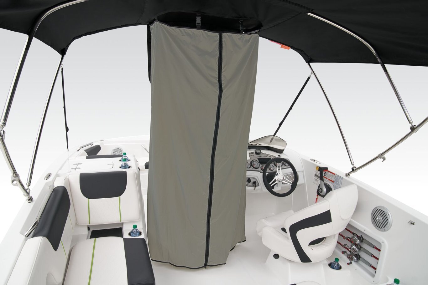 Escape the sun and keep your cool with the standard Bimini top with a stainless steel frame. A drop-down changing curtain offers convenience and privacy.