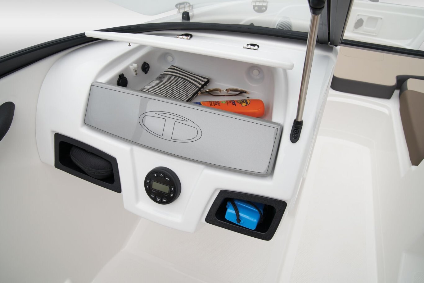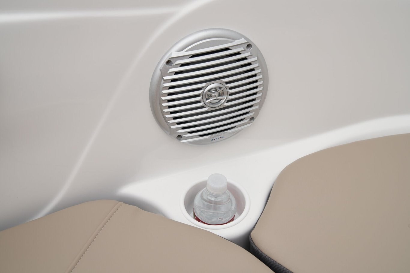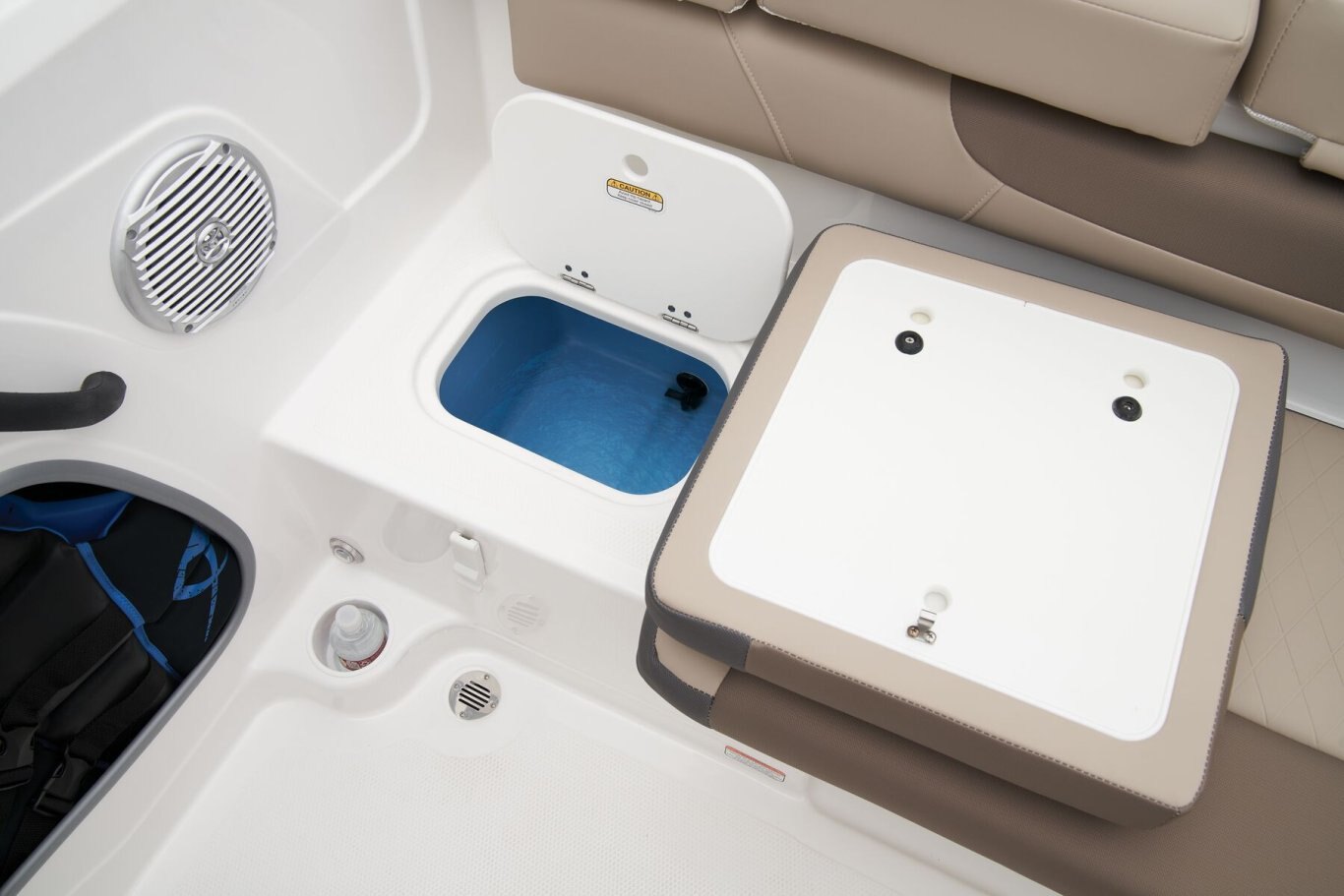 Set your boat up for watersports with the ski-tow pylon receptacle. Between skiing runs, relax on the aft full-width cushioned sundeck or the port and starboard swim platforms. After you practice your cannonballs, use the fold-down boarding ladder to easily reboard. A 10-gal. aerated livewell keeps you prepared to fish when the biting's good. When the bites slow, crank up the 4-speaker Jenson® stereo with Bluetooth® compatibility.