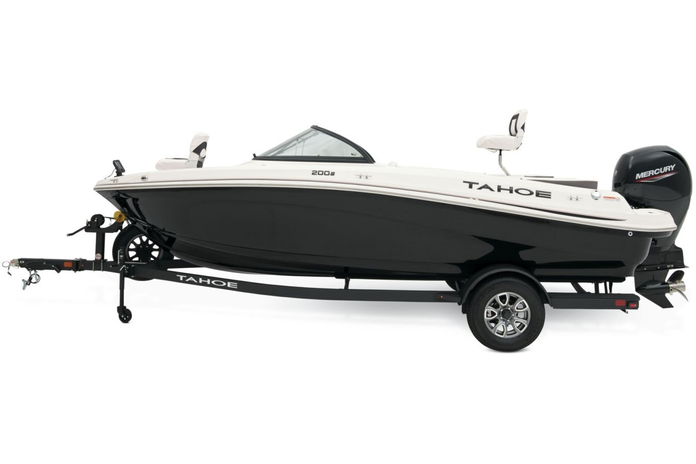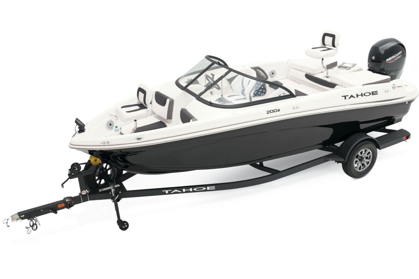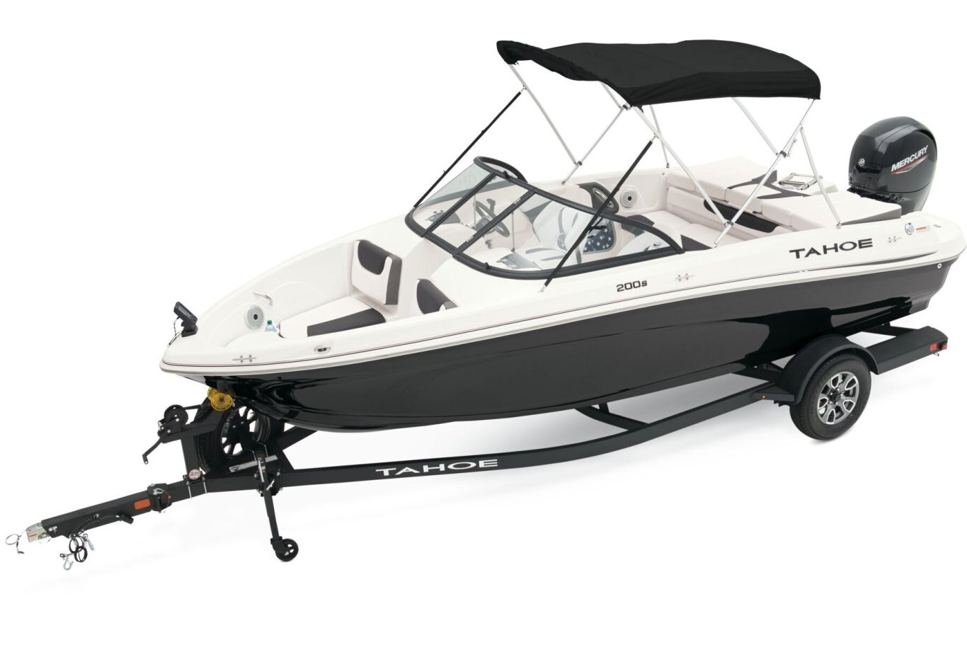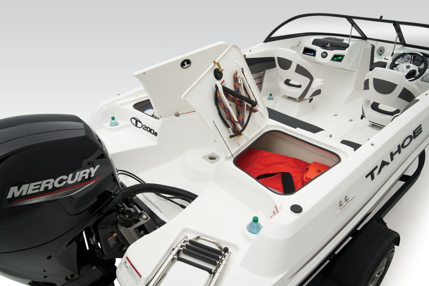 Fish and ski sunny days away in the 2025 TAHOE® 200 S! This performance-designed boat has everything lake adventurers need to explore the waters the way they like. Pilots can take control with the cockpit's hydraulic steering, precision gauges, water-resistant toggle switches, and hidden storage. Go full throttle to experience the POWERGLIDE® hull's HYDROSTEP strakes. Up to 8 passengers can enjoy the ride in this TAHOE's dual front-deck seats, swiveling driver and passenger seats, and rear bench seat. Find your swimming hole and relax on the full-length aft sundeck with cushions that pull away to reveal hidden storage compartments—a feature shared by the other seats. Anglers will love the 10-gal. aerated livewell with an adjustable spray head. Thrill seekers can pull their wakeboard or skis from the in-floor storage compartment and ready the ski-tow pylon in a flash. Or, you can simply enjoy the water on the aft port and starboard swim platforms with a fold-down reboarding ladder. This fun-focused model sports a Jensen® stereo with 4 speakers and Bluetooth® connectivity. The 2025 TAHOE® 200 S comes standard with 115hp Mercury® EXLPT FourStroke outboard motor and has a recommended maximum 175hp rating. This model is packaged with a trailer. |
