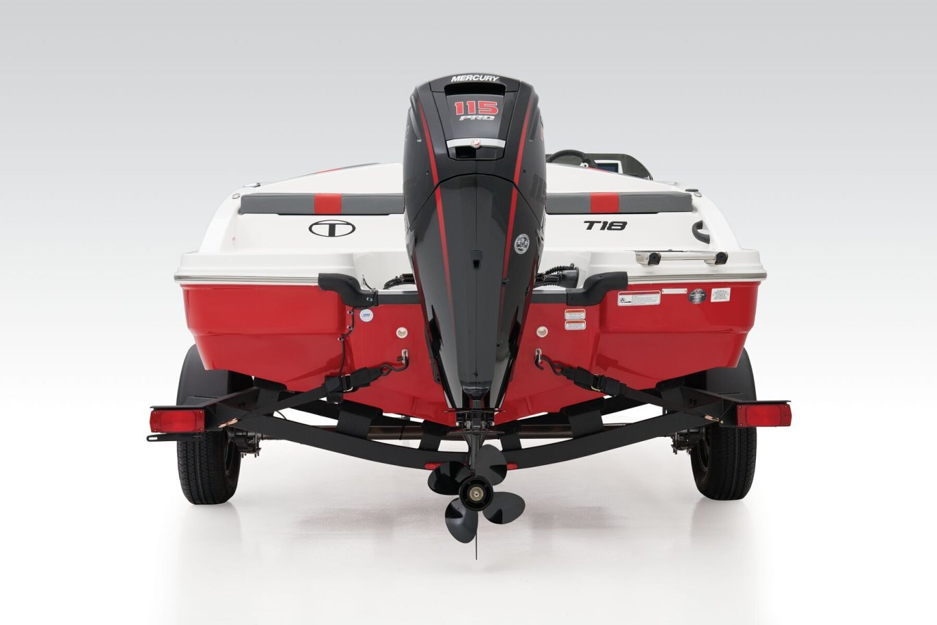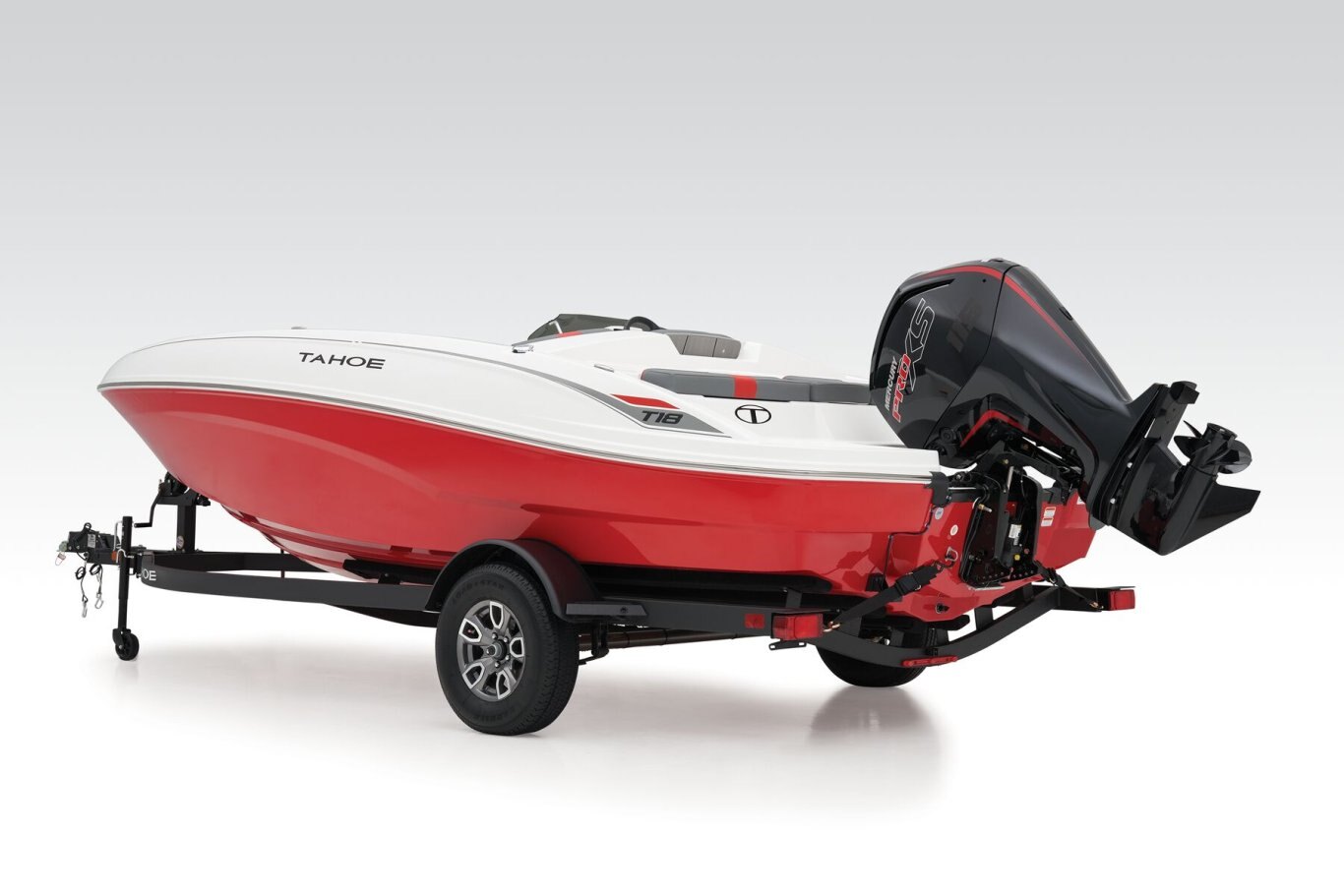 The 2026 TAHOE® T18 comes standard with a 90hp Mercury® ELPT FourStroke outboard motor and has a recommended maximum 115hp rating. This model is packaged with a trailer.