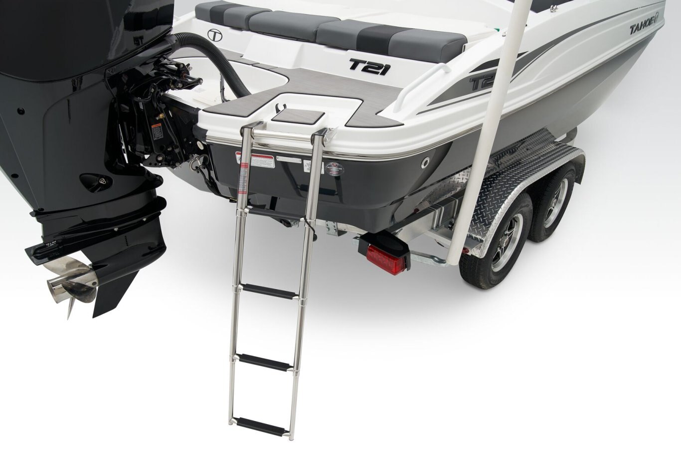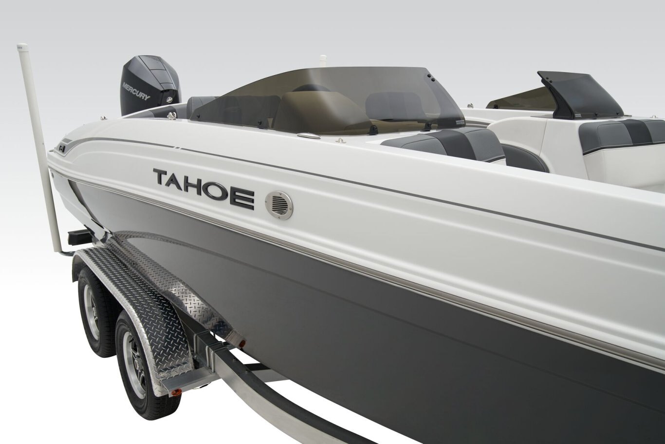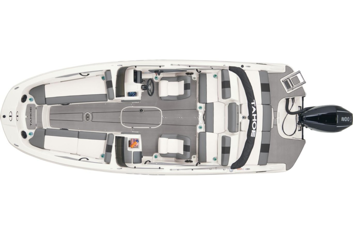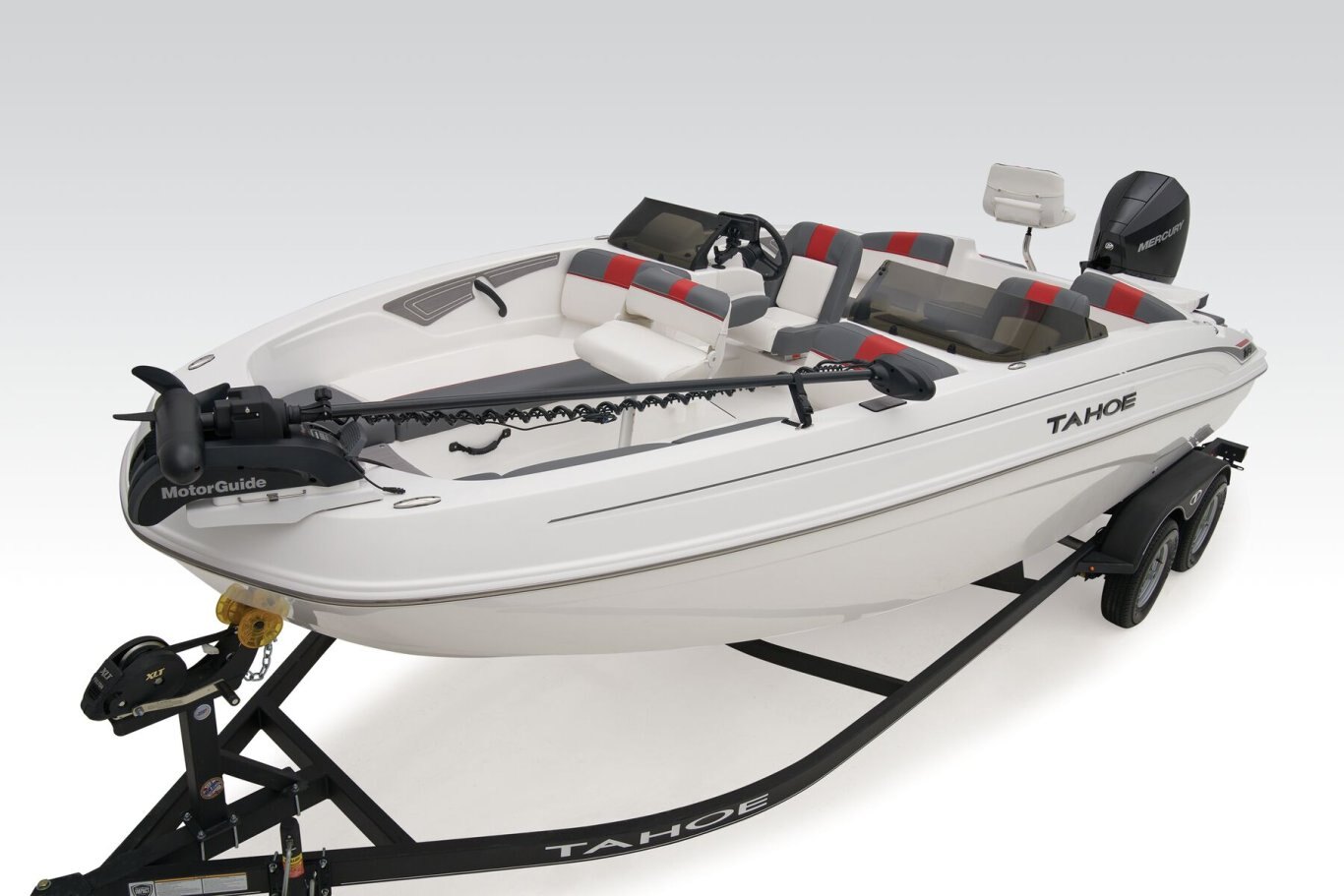Up to 11 passengers can feel the thrill thanks to the T21’s POWERGLIDE® hull with HYDROSTEP strakes that enhance stability and overall performance. Raise the standard removable ski-tow pylon to take on your exciting watersports. The console’s 8” touch screen with digital switches updates you with information such as your motor’s vitals, the water’s depth, and your current speed. Play DJ with the Bluetooth®-compatible Kicker® stereo. Take your places in the luxurious dual forward lounges, dual midship bucket seats, and the aft 3-across bench. You’ll find space for your gear and supplies under the seats and sun-pad cushions, consoles, and the in-floor storage compartment. When you’ve found a cove you want to explore, the anchor locker, dual aft swim platforms, and telescoping ladder make diving into the waters and getting back into the boat easy. The 2026 TAHOE® T21 comes standard with a 150hp Mercury® XL Pro XS® FourStroke outboard motor and has a recommended maximum 200hp rating. This model is packaged with a trailer. |