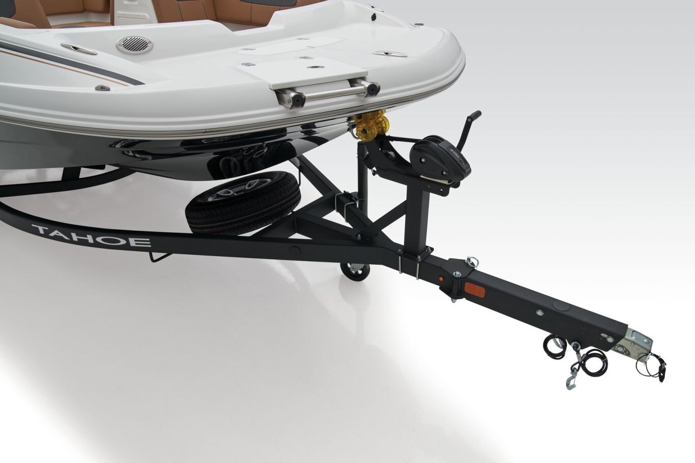 Custom-fit, tandem-axle trailer w/GALVASHIELD® Impact corrosion protection; 14" (35.56 cm) aluminum wheels w/radial tires & spare tire; & brakes on both axles — includes fold-away tongue jack; space-saving, swing-away tongue; heavy duty winch w/nylon strap & bow safety strap; safety cables; & LED submersible lights (additional freight charge applies for standalone trailer purchase)