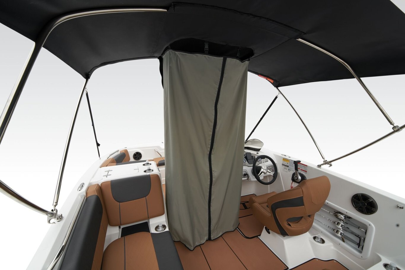 Escape the sun and keep your cool with the standard Bimini top with a stainless steel frame. A drop-down changing curtain offers convenience and privacy.