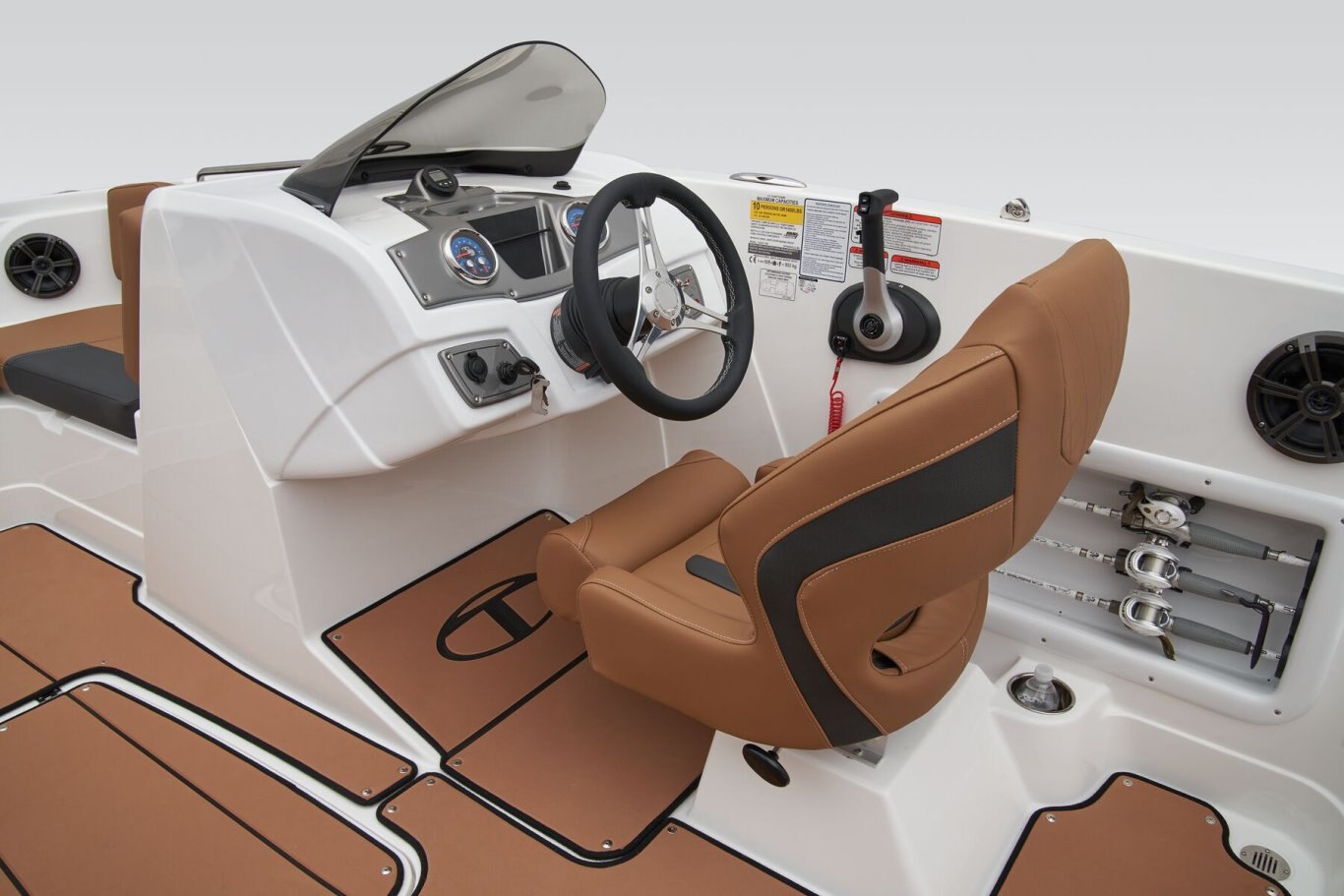 The helm boasts traditional gauges and switches for a more hands-on pilot experience. This TAHOE® is always ready to cast a line with its in-gunnel rod storage, standard 11.5-gal. livewell, and large swim platforms that can be upgraded with fishing seats. If the bites are slowing down, bring up the party playlist on the 4-speaker, Bluetooth®-compatible Kicker® stereo. After cooling off in the water, reboard with ease thanks to swim ladders at either end of the boat.