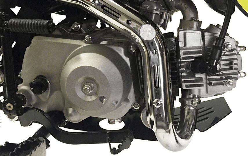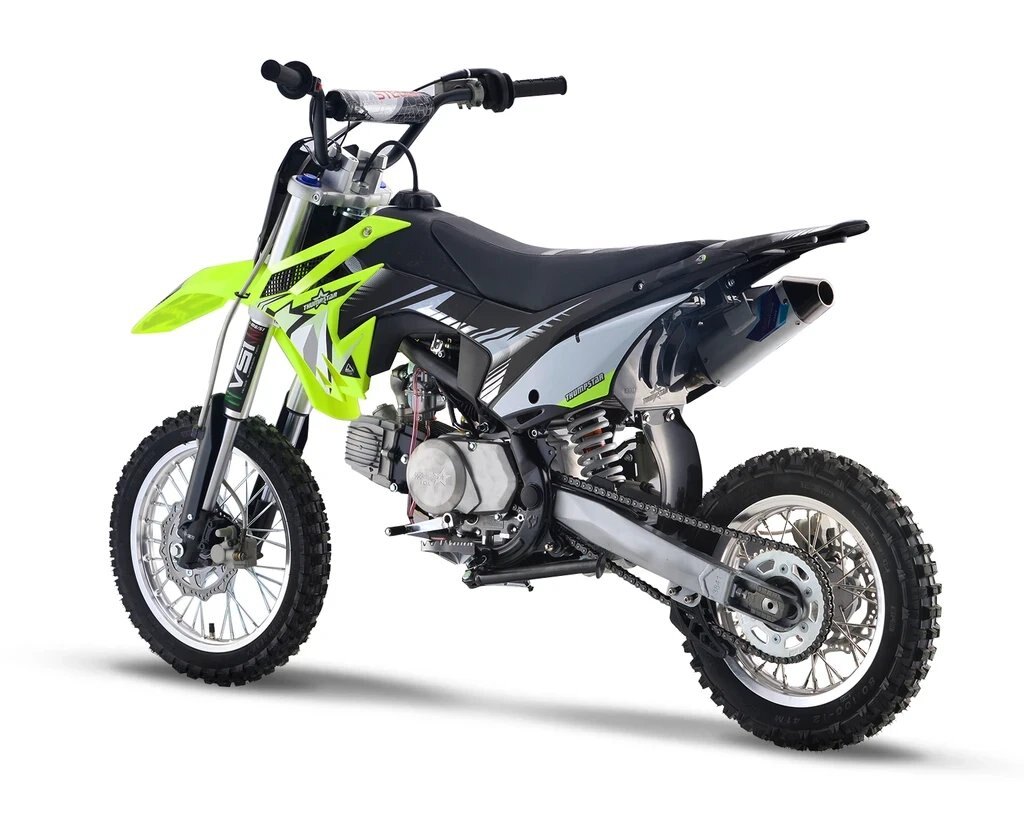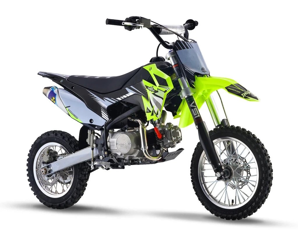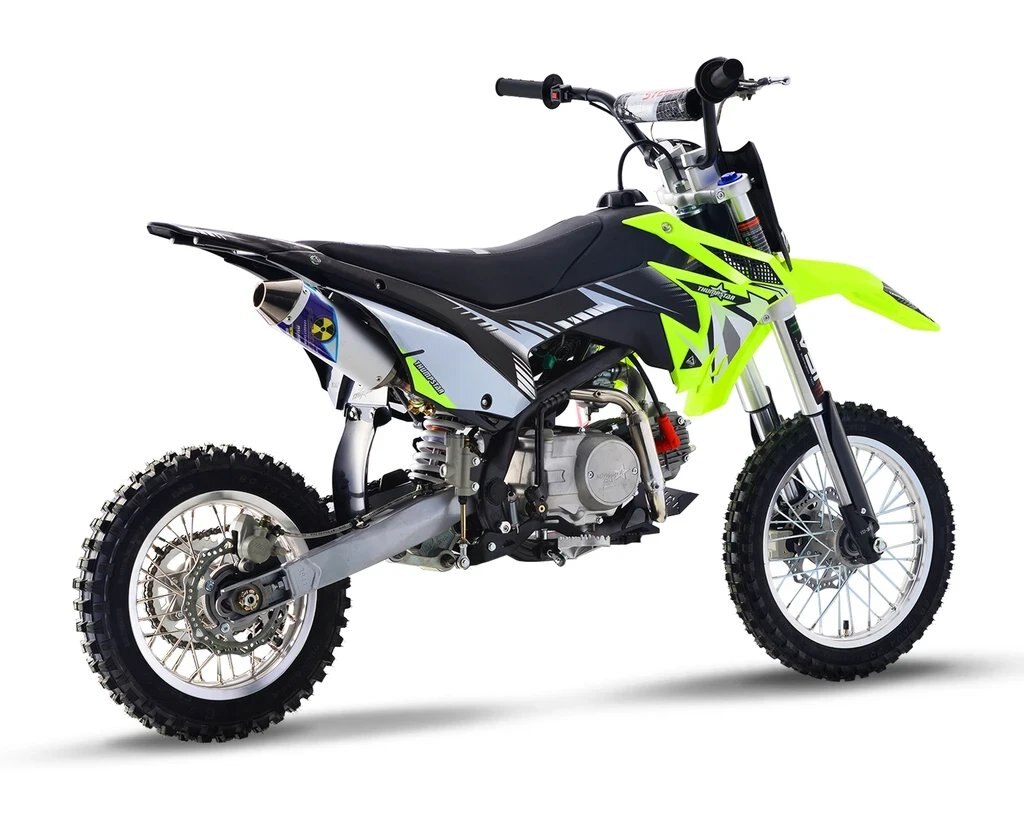 We've done an overhaul on a few of our bikes with the new line-up, and the TSR110 wasn't left out. The new TSK 110cc is gearing up in style with all the looks of the bigger motocross bikes but designed for kids, beginner riders and we all know experienced adults also love riding this model also. TSK 110 has a seat height of 720mm and 4 speed semi automatic gearbox which is similar specifcations to its competitors(TTR110, CRF110, KLX110, DRZ110), your little ones will fill all in laughter and smiles. Highlighted with special features including Chartreuse Plastics, Stripe Gripper Seat and AK-7 Alloy Rim this bike allows your teens to have fun and enjoy their new motorcycle. Although having electric start the 110 is still optioned with a kickstart. The TSR110 has received a complete overhaul for Version 5. Gone are the days of facing struggles of dealing with issues which are common on many other mini bikes. We have gone back to the drawing board and scratch built a New Frame, Airbox, Linkage Suspension, Hubs and Rims, and much more. This has not only allowed our bikes to become much more strong and reliable, but also gives the rider peace of mind knowing that, no detail has been left untouched. Our design team has produced a piece of engineering art, the frames are a new Quad Bar which has made them stronger than ever. Along with the frame developments we made space and rigged them with mounts to accommodate our new caged airboxes, this allows a better air filtration system while increasing airflow into the carburetor and in turn more horsepower. A first on pit bikes and minibikes alike, we have scaled down the linkage from the likes of a full size race bike, and fitted it to these smaller sized 110s. The linkage provides a much smoother ride than traditional PDS style suspension which allows for faster cornering, high and low speed adjustments, and increased rider comfort. We have redesigned our hubs and created space for a much heavier duty 20mm rear axle, coupled with stainless spokes and alloy rims, which provide our strongest wheels to date. Check out our description video and the following spec lists to see these upgrades! |