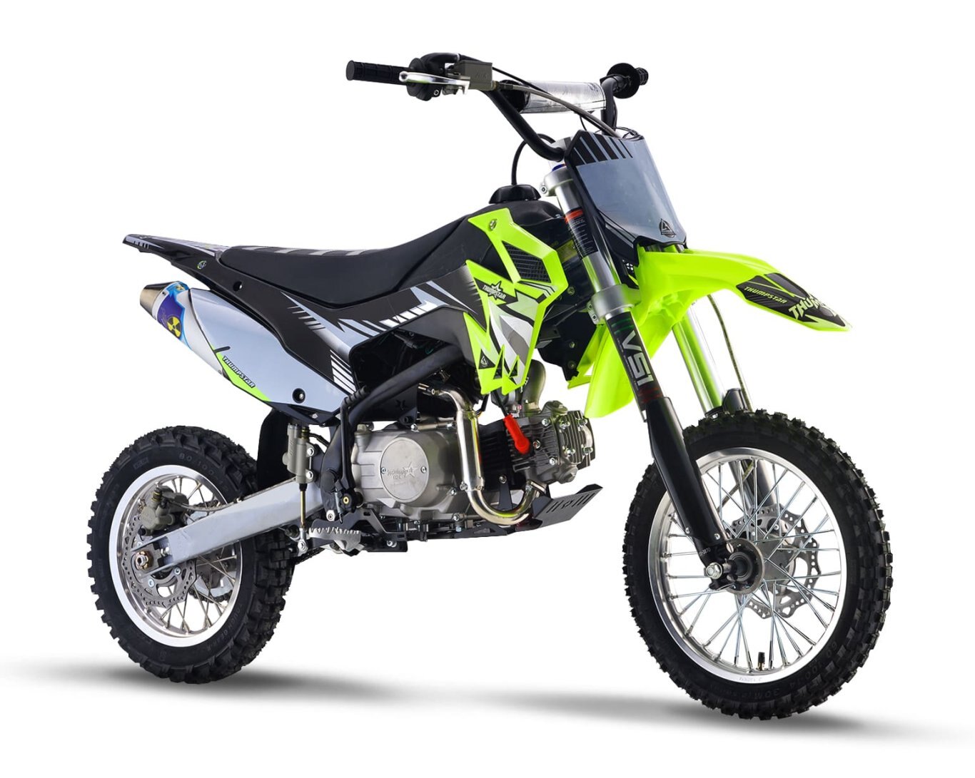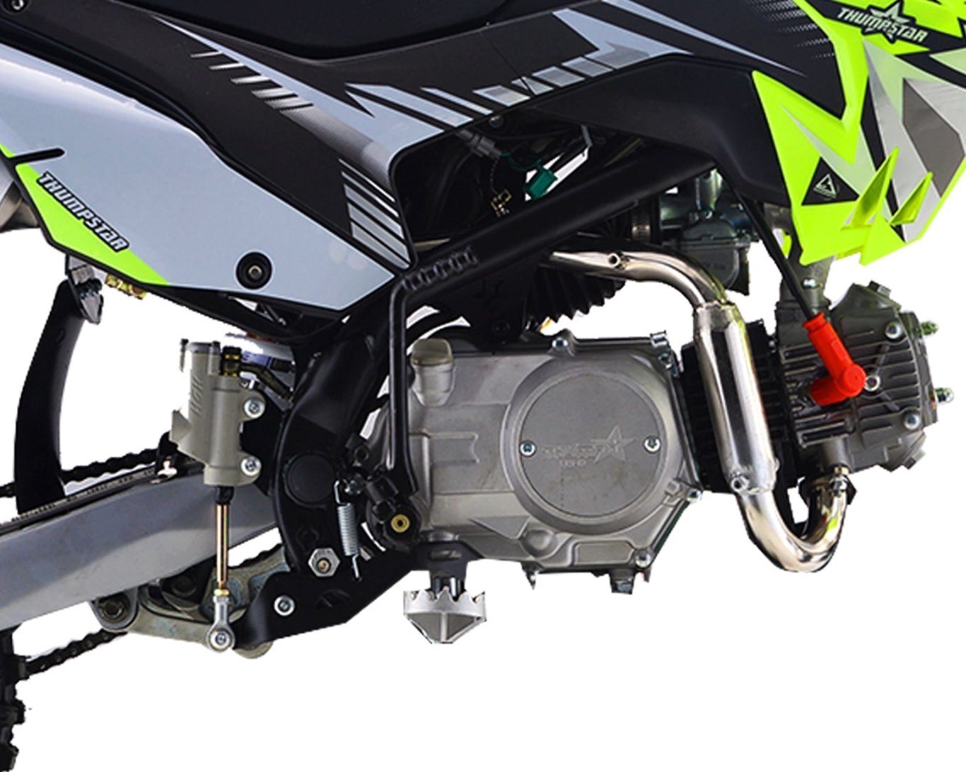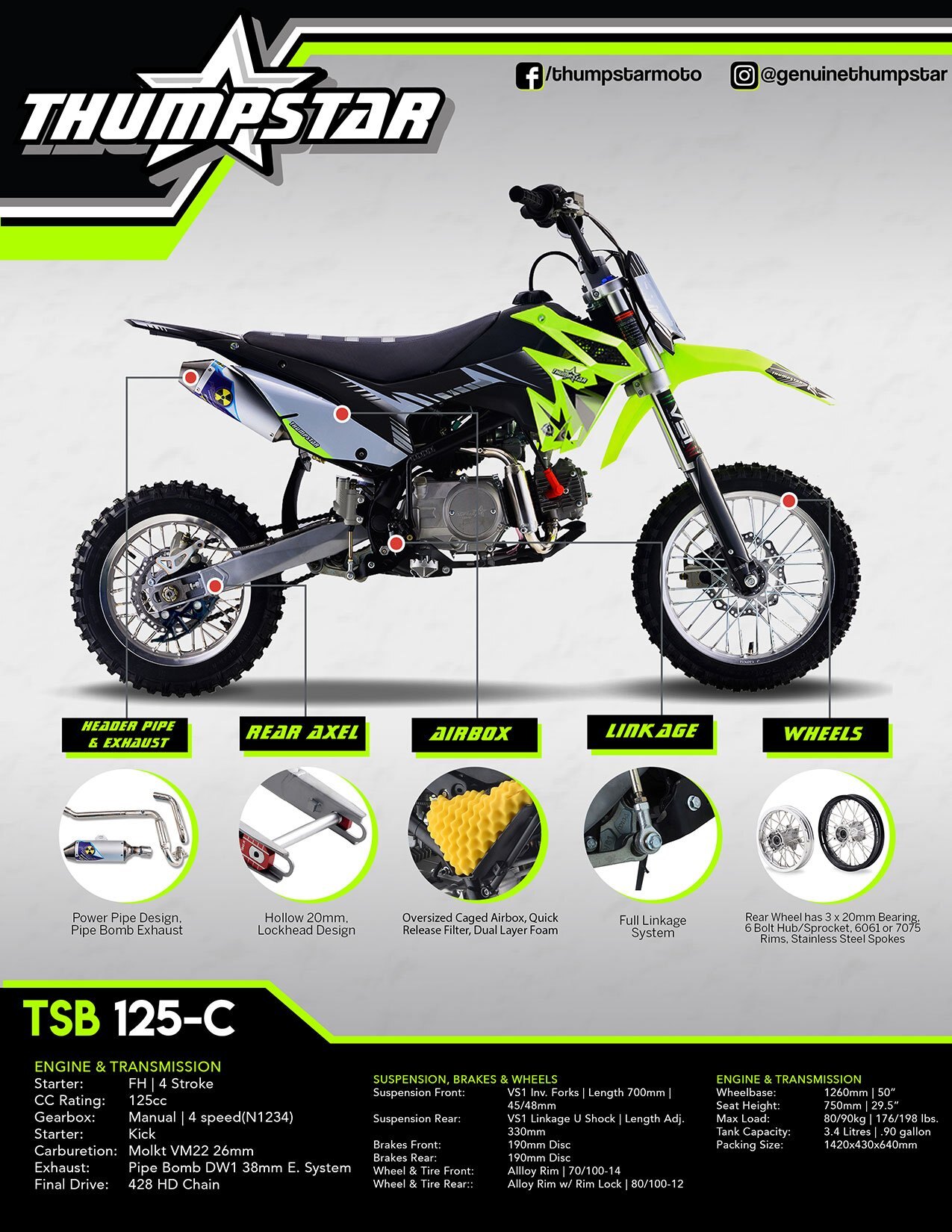 We've done an overhaul on a few of our bikes with the new line-up, and the TSB 125E wasn't left out. The new TSB 125E is gearing up in style with all the looks of the bigger motocross bikes but designed for kids, beginner riders and we all know experienced adults also love riding this model also. TSB 125E has a seat height of 710mm and 4 speed manual gearbox your little ones will feel all laughter and smiles. Highlighted with special features including Chartreuse Plastics, Stripe Gripper Seat and AK-7 Alloy Rim this bike allows your teens to have fun and enjoy their new motorcycle. Being electric and kick start it is very easy to start. So, kick it over and surf the dirt away. The TSB 125E has received a complete overhaul for Version 5. Gone are the days of facing struggles of dealing with issues which are common on many other minibikes. We have gone back to the drawing board and scratch built a New Frame, Airbox, Linkage Suspension, Hubs and Rims, and much more. This has not only allowed our bikes to become stronger and more reliable, but also gives the rider peace of mind knowing no detail has been left untouched. Our design team has produced a piece of engineering art. The frames are a new Quad Bar which has made them stronger than ever. Along with the frame developments we made space and rigged them with mounts to accommodate our new caged airboxes. This allows a better air filtration system while increasing airflow into the carburetor, and in turn, more horsepower. A first on pit bikes and minibikes alike, we have scaled down the linkage from the likes of a full-size race bike and fitted it to these smaller sized 110s. The linkage provides a much smoother ride than traditional PDS style suspension which allows for faster cornering, high and low speed adjustments, and increased rider comfort. We have redesigned our hubs and created space for a much heavier duty 20mm rear axle, coupled with stainless spokes and alloy rims, which provide our strongest wheels to date. Check out our description video and the following spec lists to see these upgrades! |