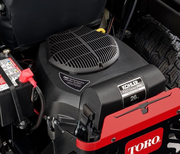 Specifications subject to change without notice and without incurring obligation. Products depicted are for demonstration purposes only. Actual products offered for sale may vary in design, required attachments and safety features. *26 HP gross (747 cc) at 3,600 RPM SAE J1940 and SAE J2723, as rated by Kohler®. As configured to meet safety, emission and operating requirements, the actual engine horsepower on this mower may be significantly lower. †See retailer for warranty details.