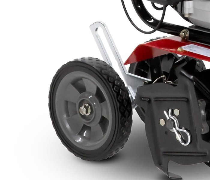 • Convenient on-board wheels adjust up and down for easy transport around the garden and provide depth control while cultivating.